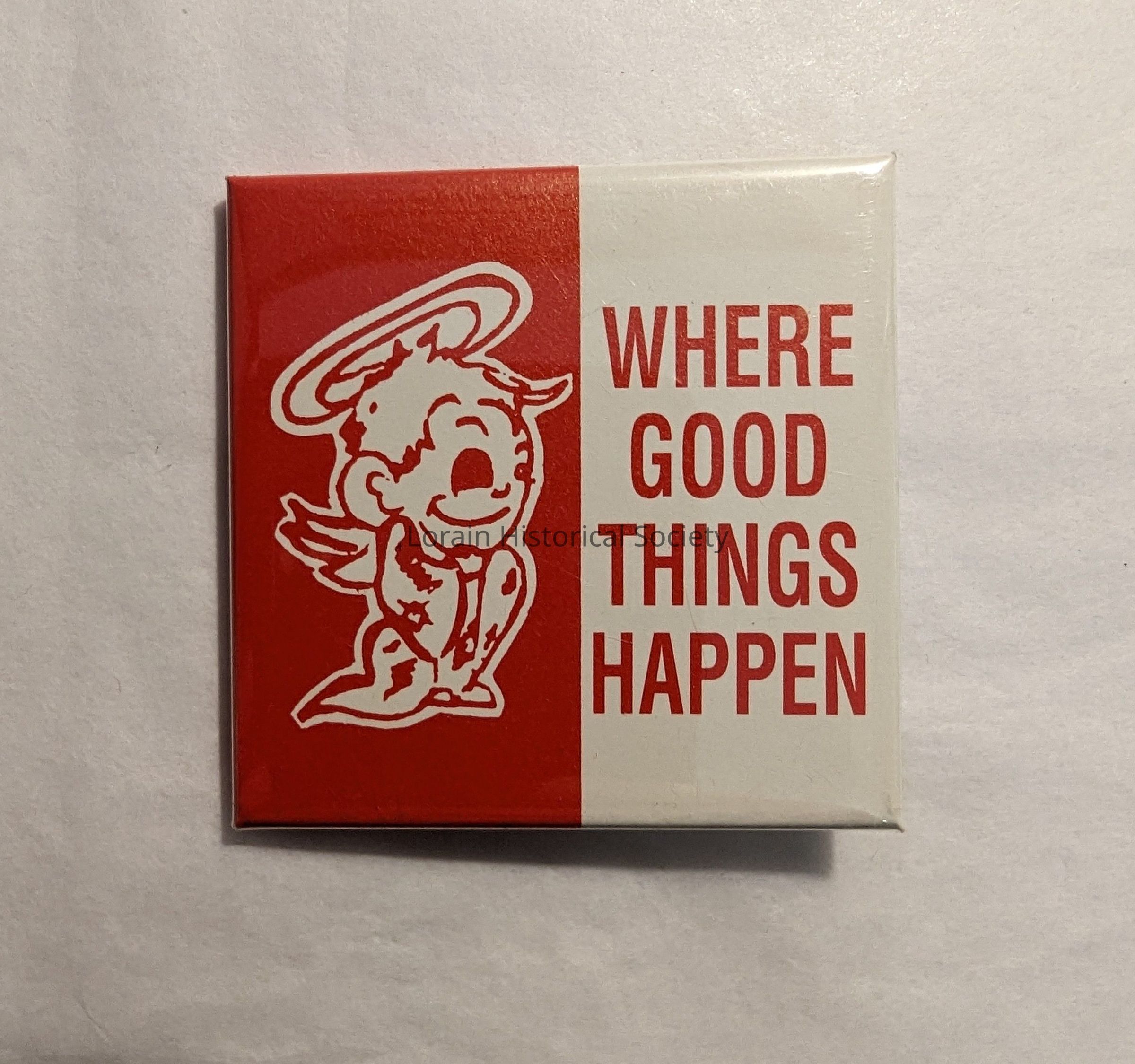 The pin is a square shape. The background on the one left side of the button red and the background on the right side is white. On the red background is the saints angel in red and white. On the white background is red lettering that reads, "Where Good Things Happen".Acquisition