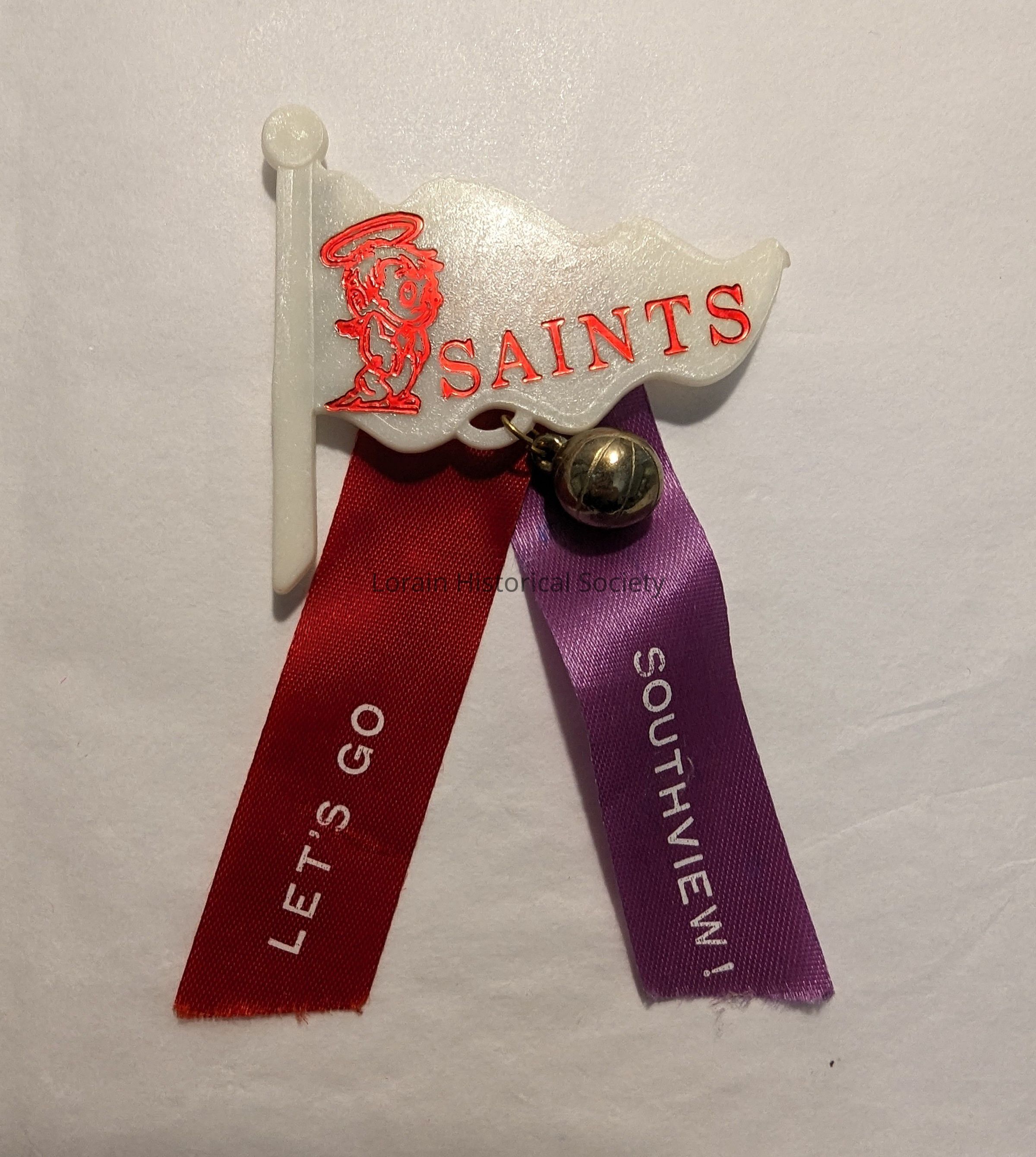 1 Southview Saints pin. White plastic flag with red shiny lettering, "Saints", and red shiny angel. There is a small silver colored plastic ball that is attached to the white flag. There are two ribbons hanging from the flag. The one ribbon is red and it is on the left. White lettering on the red ribbon says "Let's Go". The ribbon on the right is purple and in white lettering it reads "Southview!"Acquisition