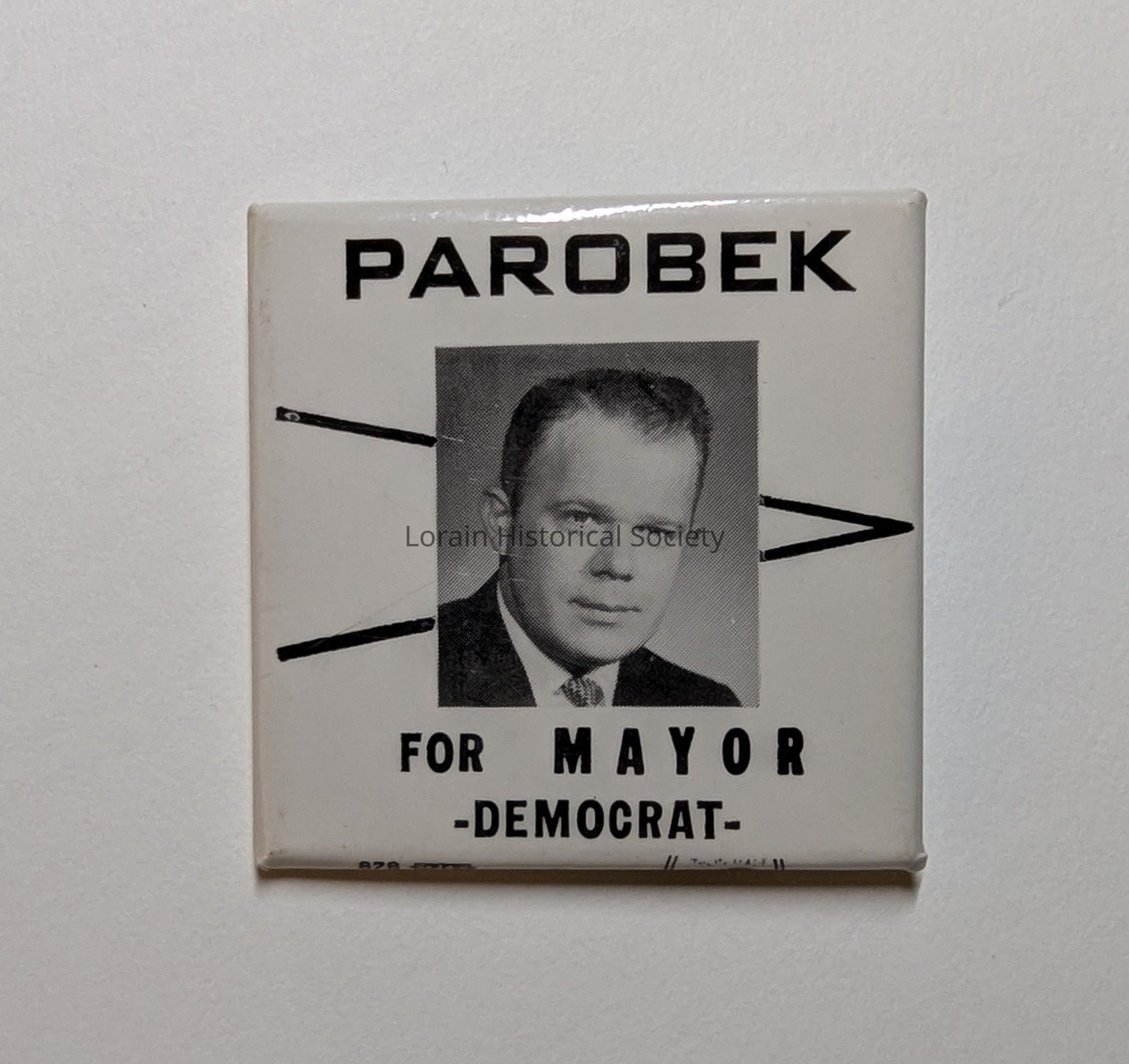 Square, white with black photo and lettering; Parobek for Mayor, DemocratContext