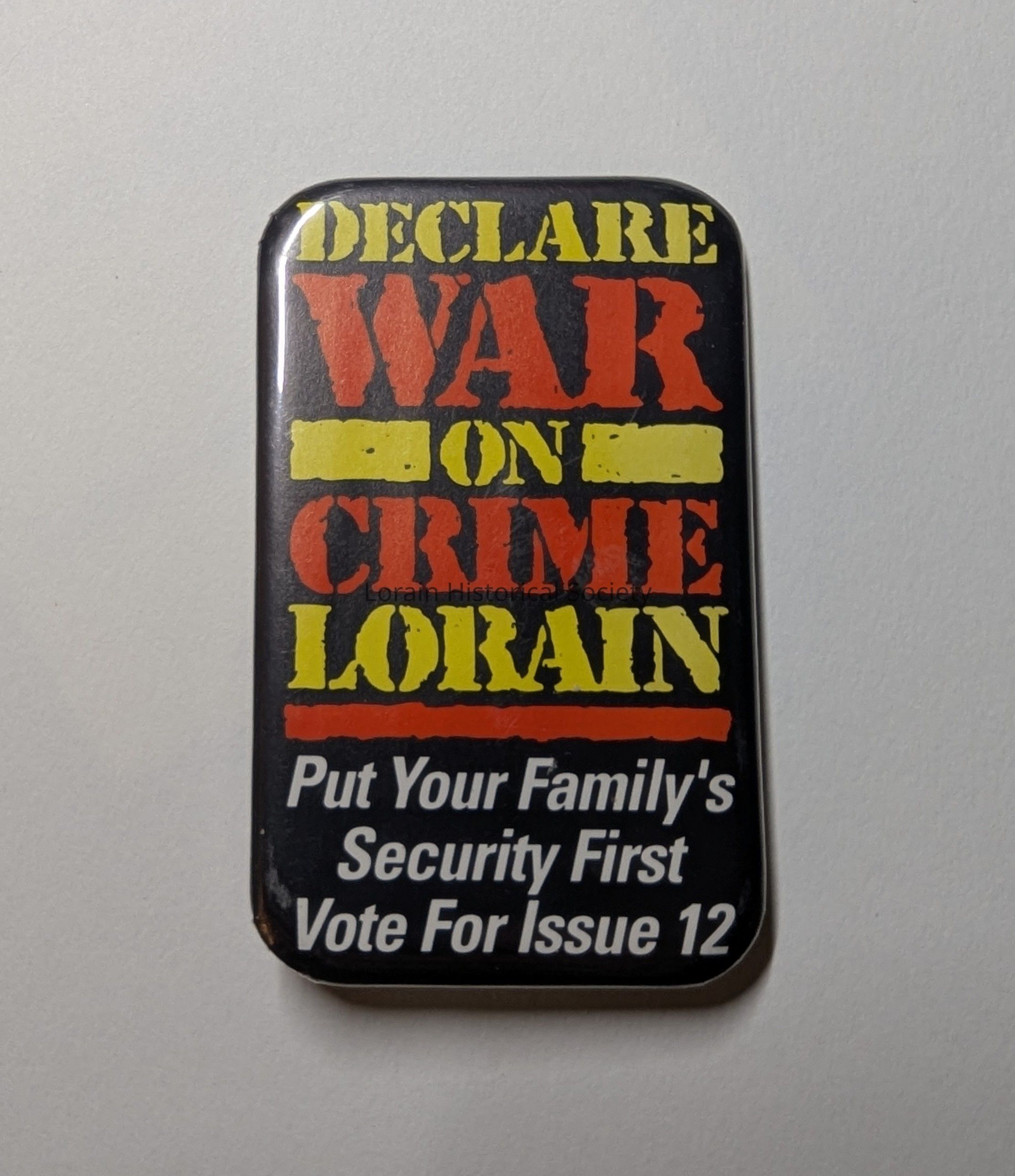 Portrait oriented rectangle pin-back style button; Black with yellow, red, and white lettering; Declare War on Crime Lorain - Put your Family's Security First, vote for Issue 12.Context