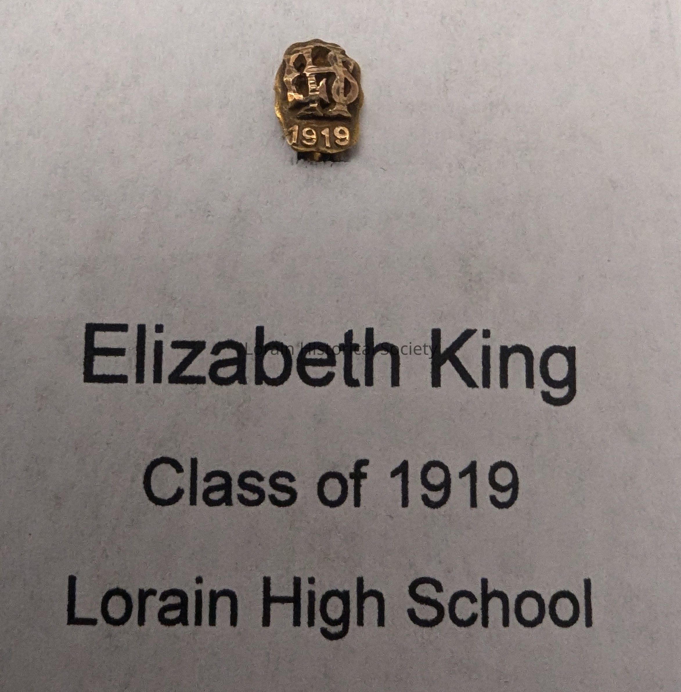 Paperwork accompanying the Lorain High School pins and the ring indicated that a James Long was the guardian for Elizabeth King and donated these items to the Black River Historical Society on April 14, 1998. This per Mr. Albert C. Doane. Re: James Long c/o Lorain National Bank, 457 Broadway, Lorain, OH 44052.
