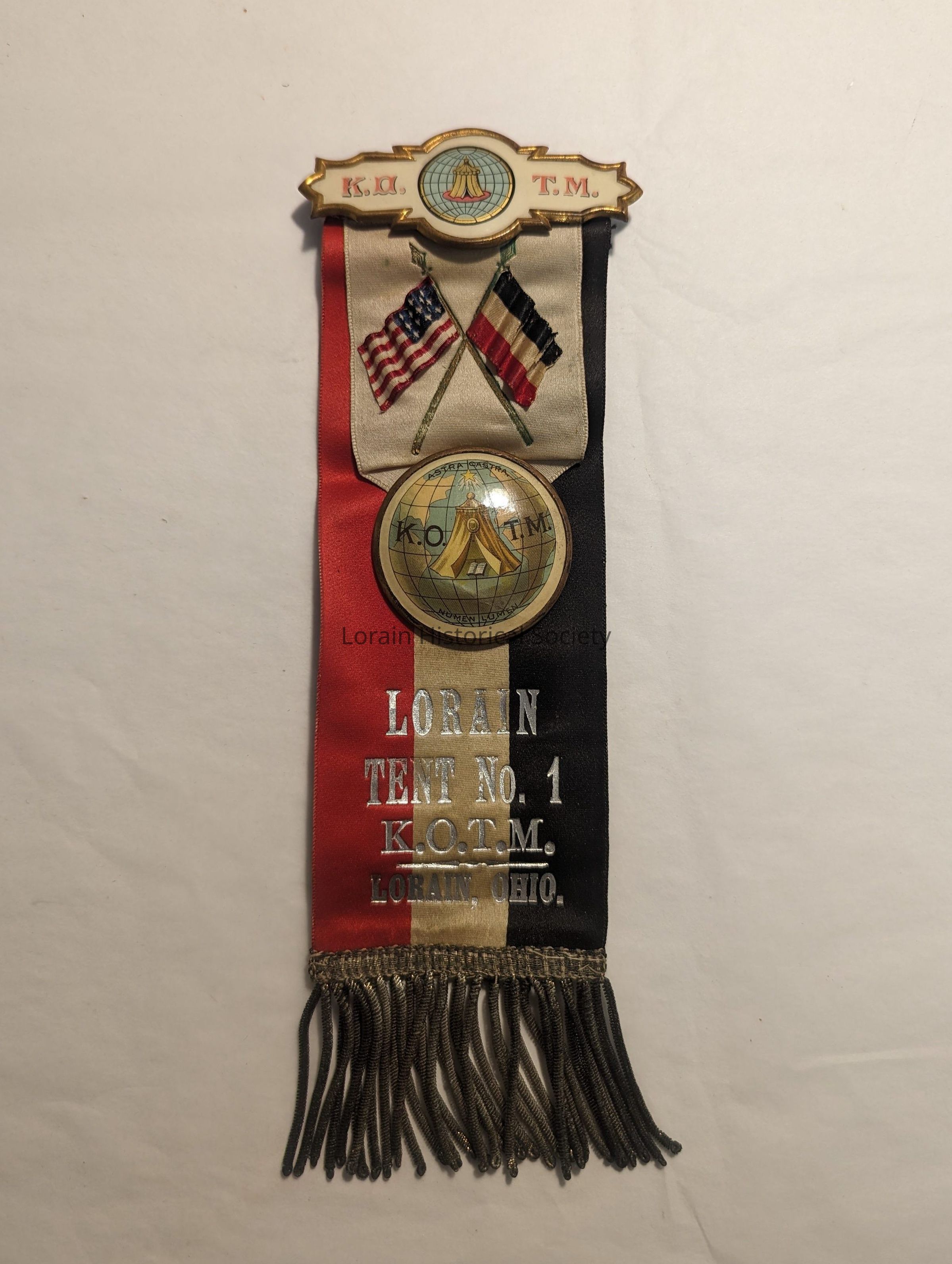 Knights of the Macabees ribbon pin; red, white, and blue with metal fringe; "K.O.T.M." with the organization logo on the pin and a medallion with "Astra Castra Numen Lumen" which means "The stars my camp, the Deity my light"; pin manufactured March 7, 1893.