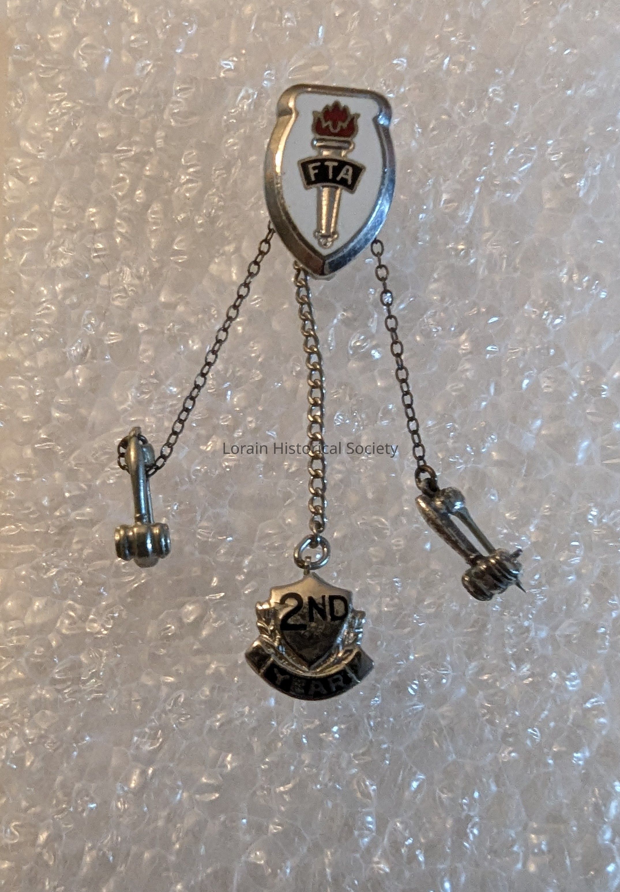 Silver with enamel head pin - FTA, three smaller pins attached to delicate chains; 2nd year pin and two gavels indicating president status for two years; Andrea Gargus (donor) was president of the Future Teachers of America during her junior and senior years at Clearview High School (class of 1969).Acquisition