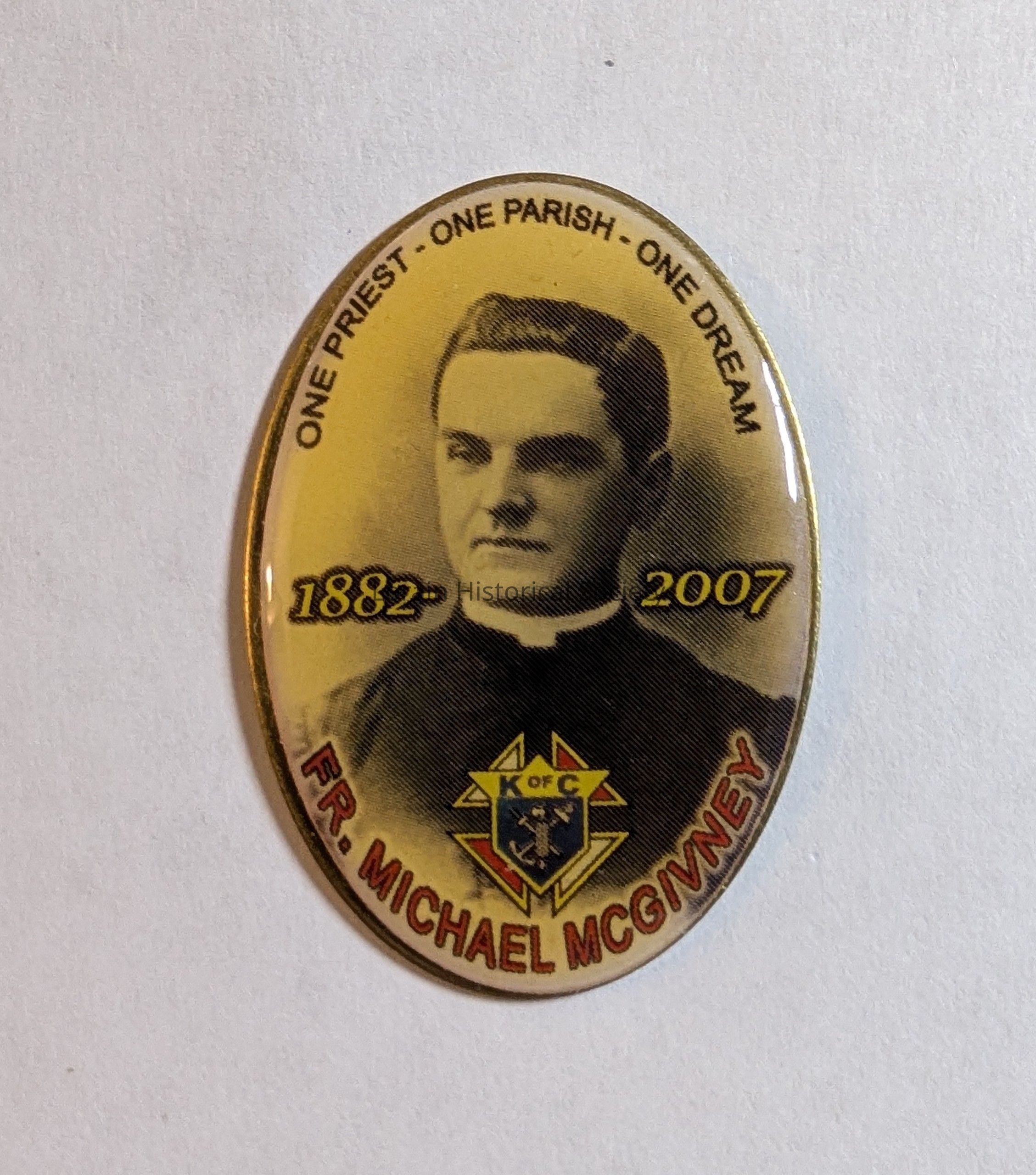 Oval shaped, approximately 1.5 inches; picture of Fr. Michael McGivney with Knights of Columbus logo and his name in red lettering; 1882-2007 in yellow lettering on each side; clear cabochon (maybe acrylic); gold colored backing and gold butterfly pin back.Context