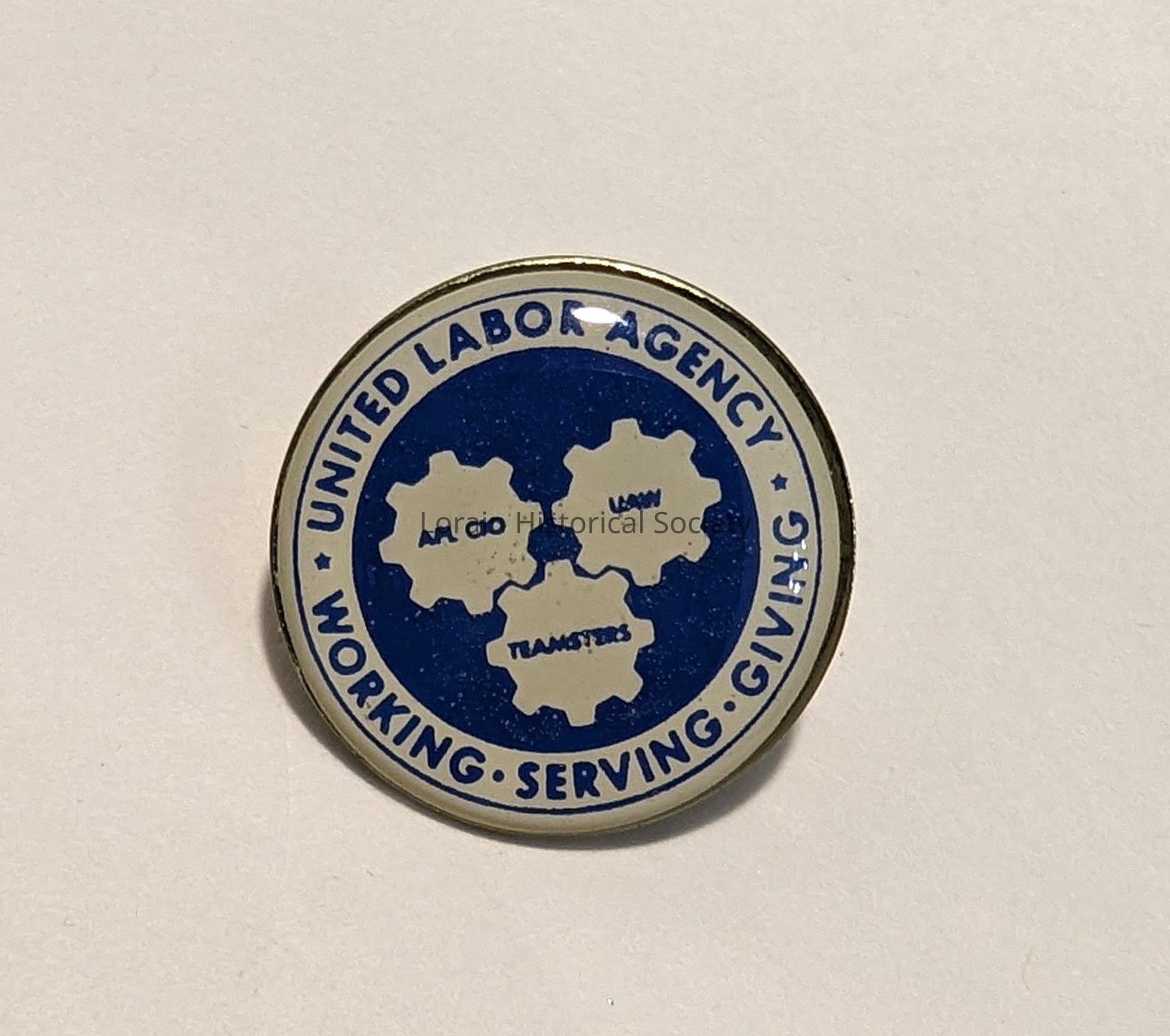 Or tie tack; small gold colored with white and blue enamel; United Labor Agency