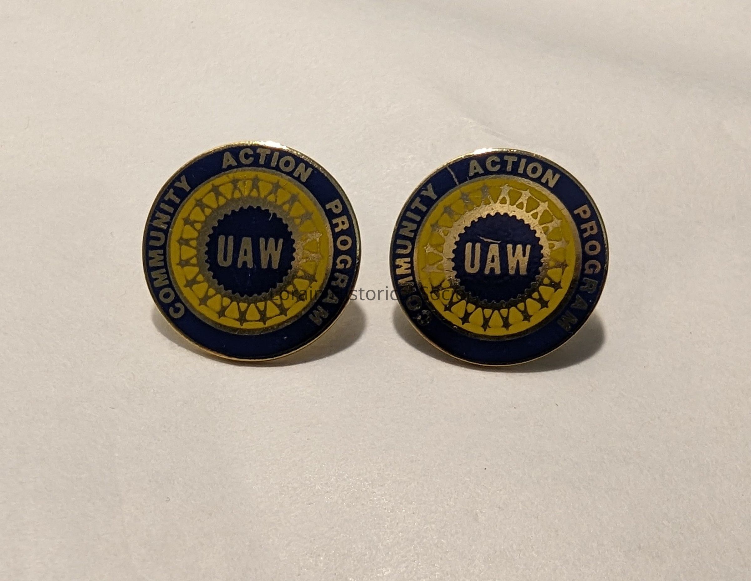 Two small round pins/tie tacks; gold with blue and yellow enamel; UAW logo - Community Action Program