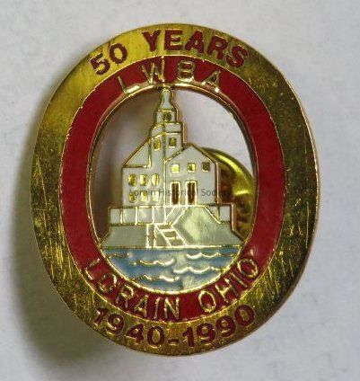 An oval shaped pin celebrating 50 years of the LWBA (Lorain Womens Bowling Association), 1940 - 1990. the pin features a replica of the Lorain Lighthouse in the center.Acquisition