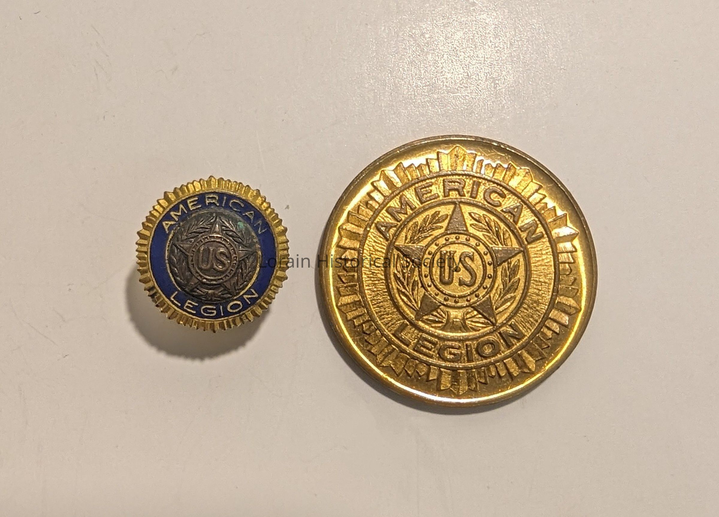 Two items; American Legion; small Lapel pin, gold and blue; gold coin - Twentieth Anniversary Armistice Day.Acquisition