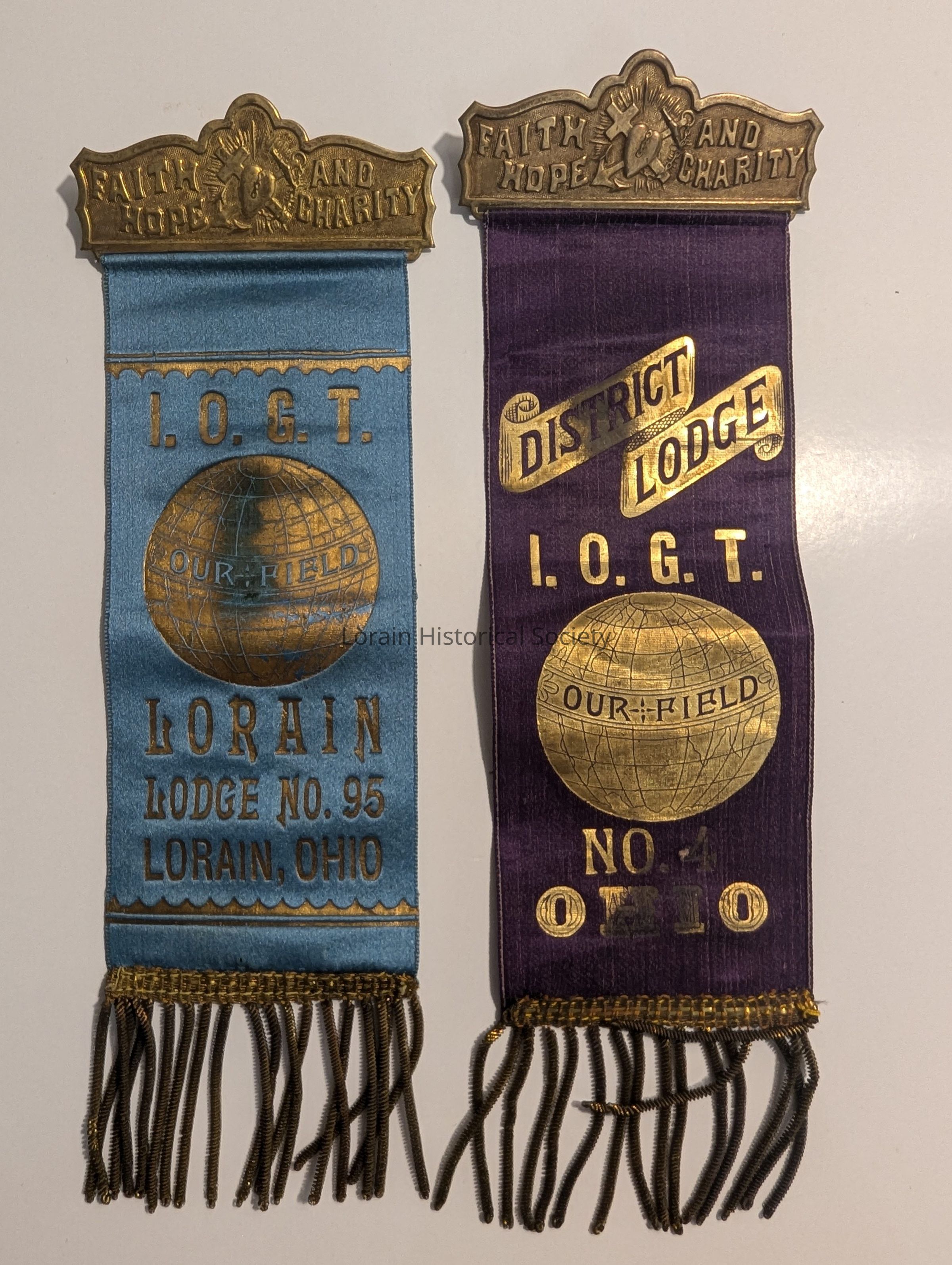 Two ribbon pins from the International Organization of Good Templars (founded as the Independent Order of Good Templars); one is blue with metal fringe at the bottom - I.G.O.T. Lorain Lodge No. 95, Lorain, Ohio; one is purple with metal fringe at the bottom- District Lodge I.G.O.T No.4, Ohio; both have a gold pin top with Faith, Hope, and Charity embossed with an anchor, heart, and cross symbol.