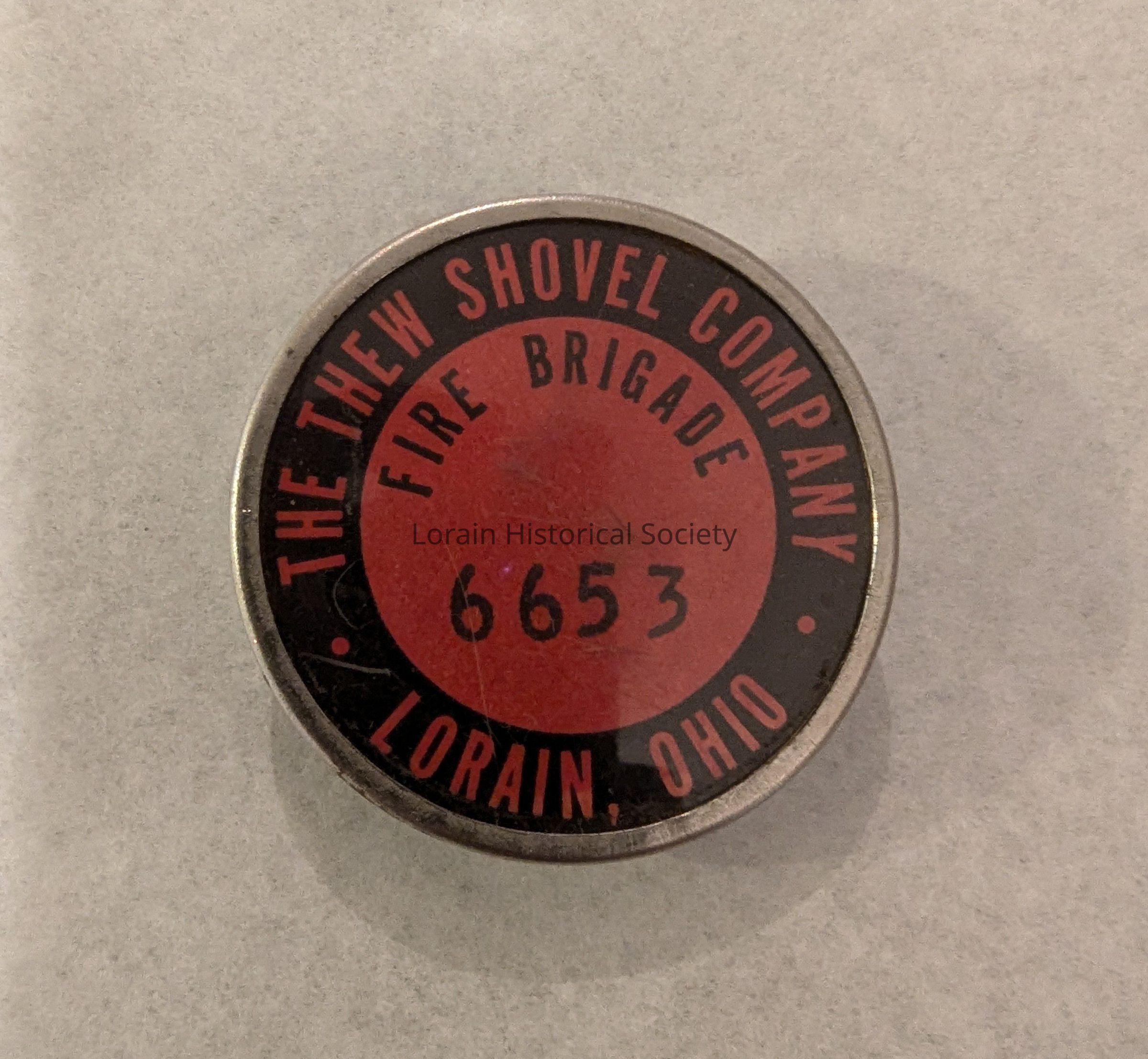 Circular pin badge that reads "The Thew Shovel Company - Lorain, Ohio" around the edge of the pin and "Fire Brigade 6653" in the center. The pin is metal, and red and black color.Collection