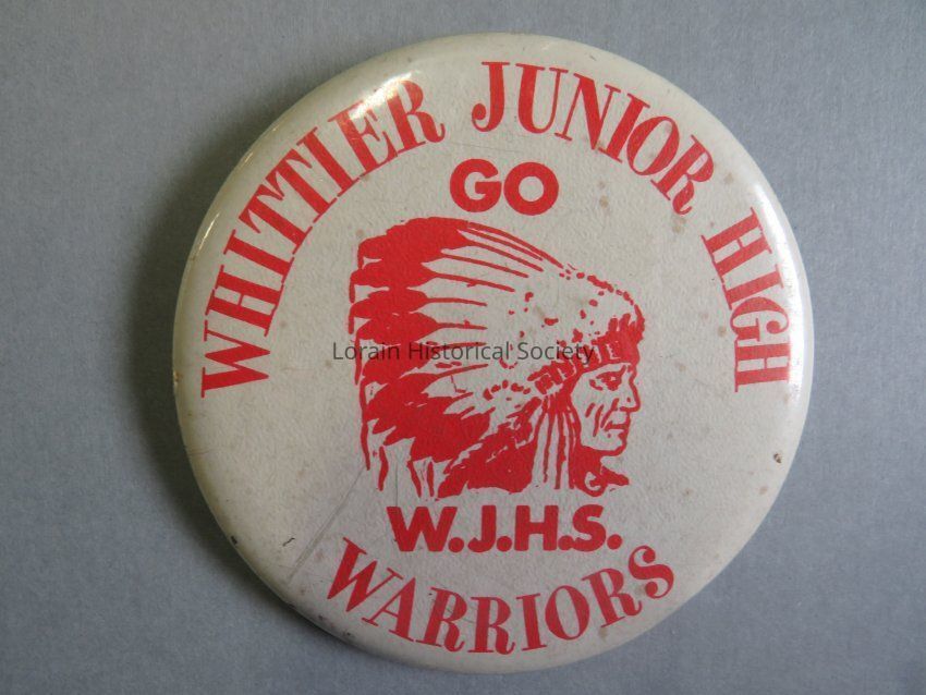 A badge/pin from Whittier Junior High, Lorain, Ohio. The badge was worn by students during sporting events. In red letters it is written: "Whittier Junior High, Go W.J.H.S. Warriors" and it also had a logo in the middle, a replica of a Native American Indian chief.Acquisition
