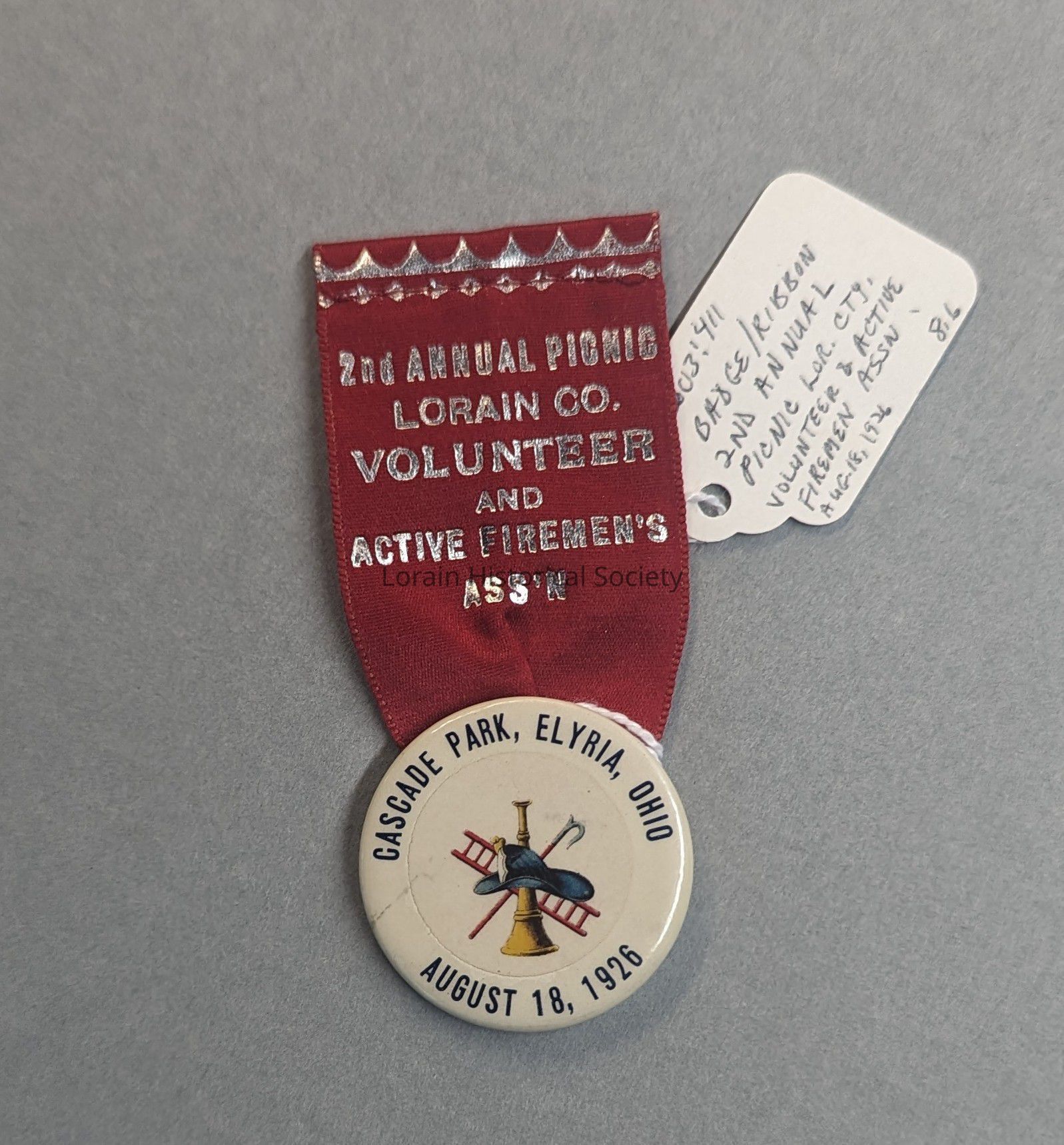 Badge/Ribbon 2nd Annual Picnic, Lorain County Volunteer & Active Firemen's Association, Elyria, Ohio August 18, 1926