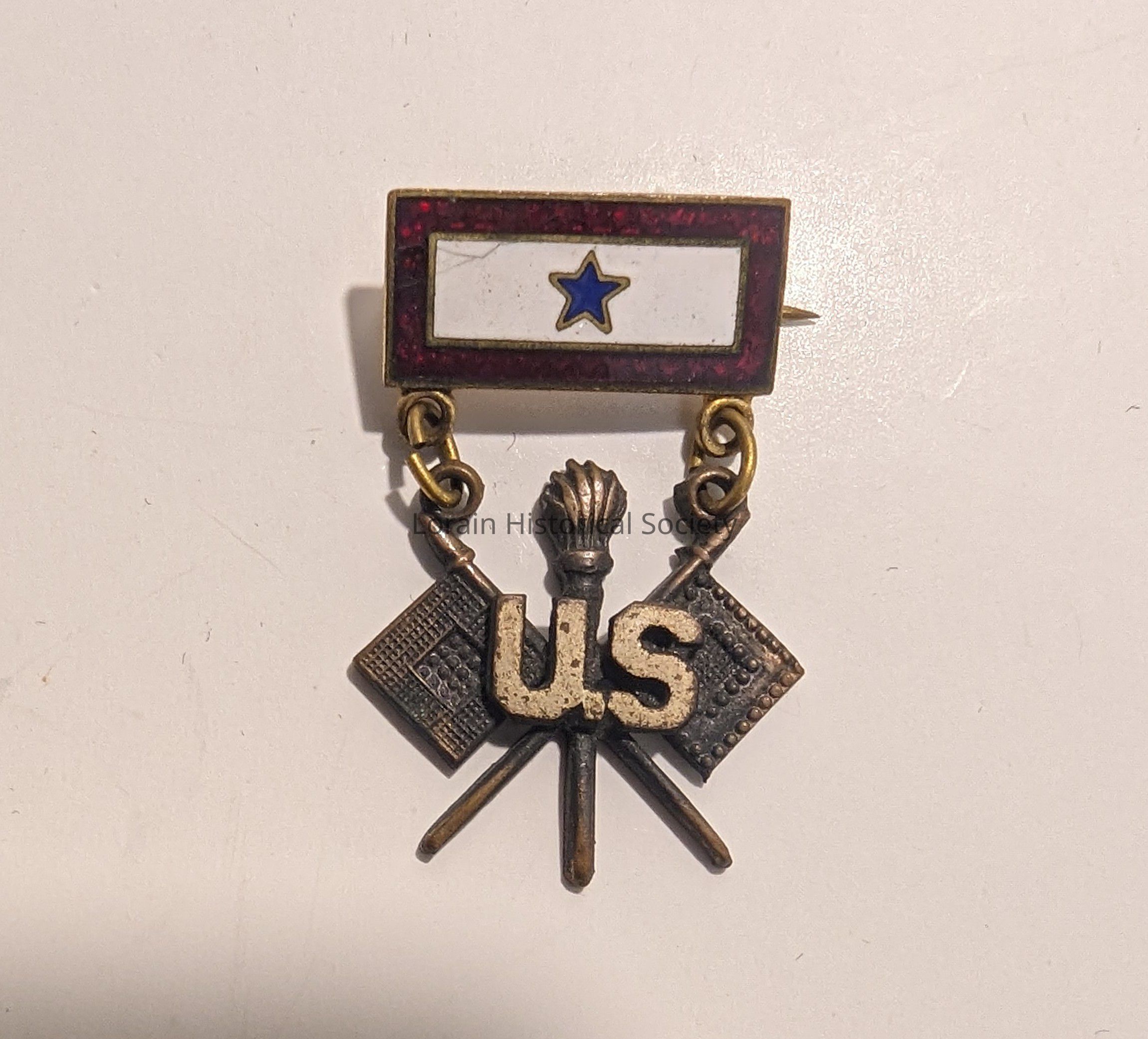 Son in service pin - one blue star, one son in service; given to parents who had an active military son overseas; signal corps insignia - two flags with crossed poles and a center torch; Allen Cuthbert served in WWIAcquisition