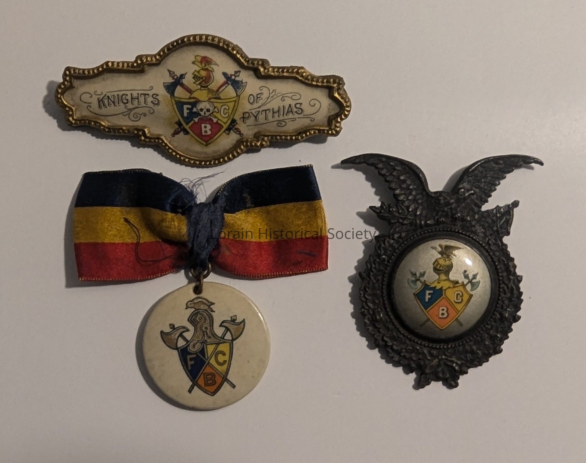 Three pins, each missing a piece; Knights of Pythias; FCB - friendship, charity, benevolence; the ornate shaped one has a pin and was most likely the top of a ribbon; the one with the ribbon does not have a pin attached; the metal one with the eagle on top has a small bar where a ribbon may have been attached.Relationships