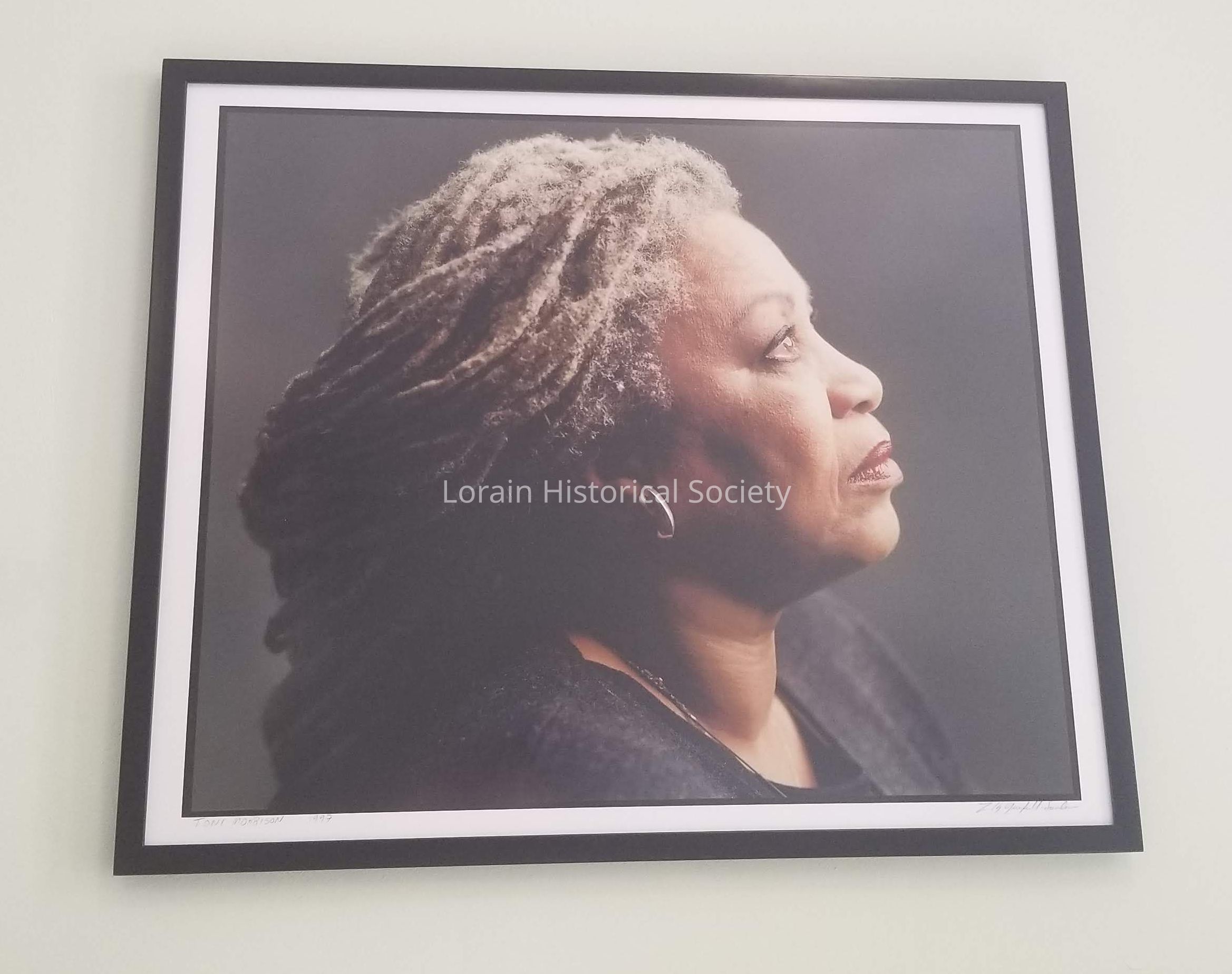 A large photographic portrait of Toni Morrison. It is an emotionally powerful, close-up, side profile of Toni's face looking to the left. The photograph is in a black frame behind glass/plastic.Collection