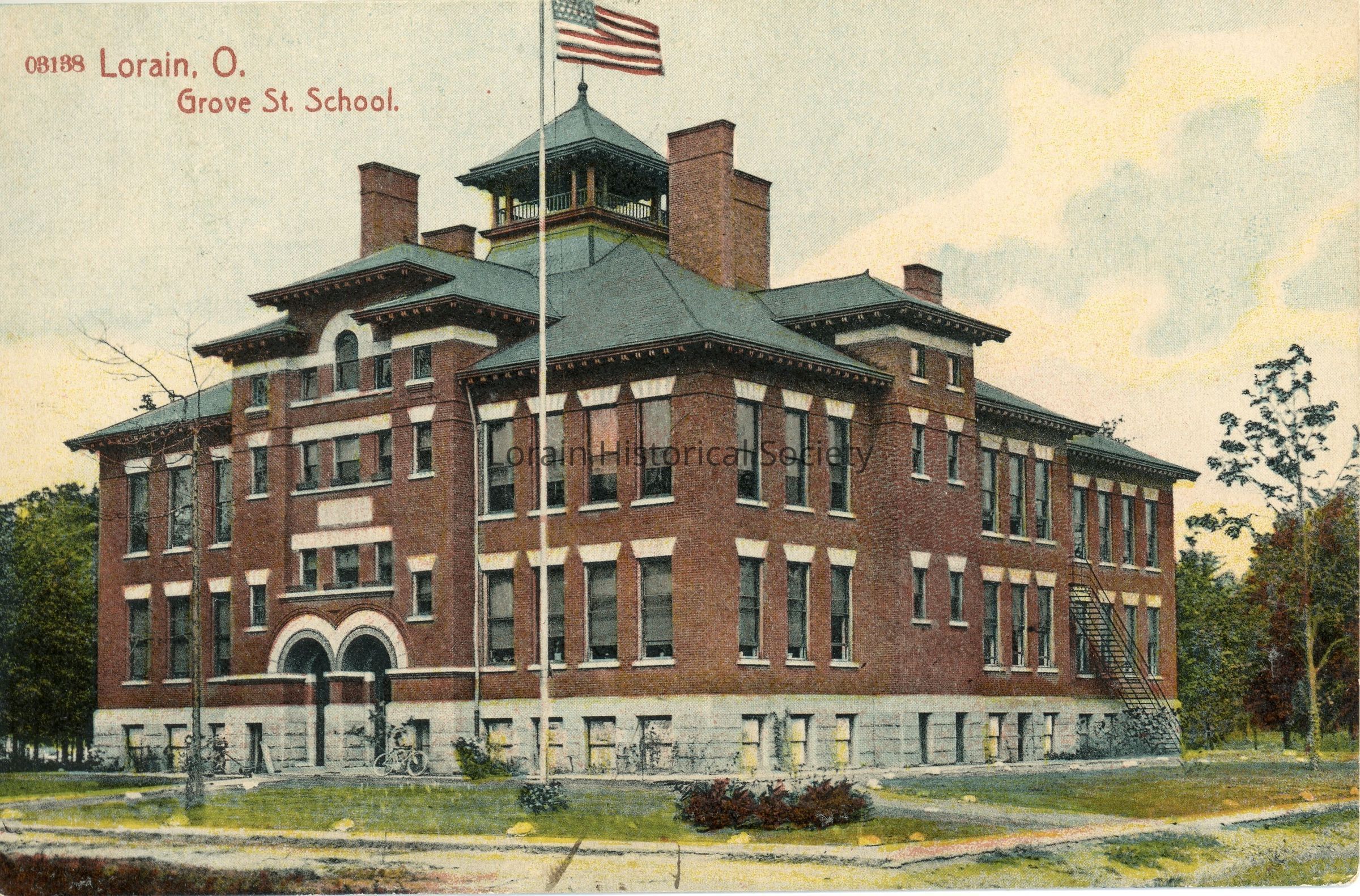 Postcard is color view of Grove Street School, NW corner of East 31st Street and Grove Avenue (later became Oakwood Elementary School).
