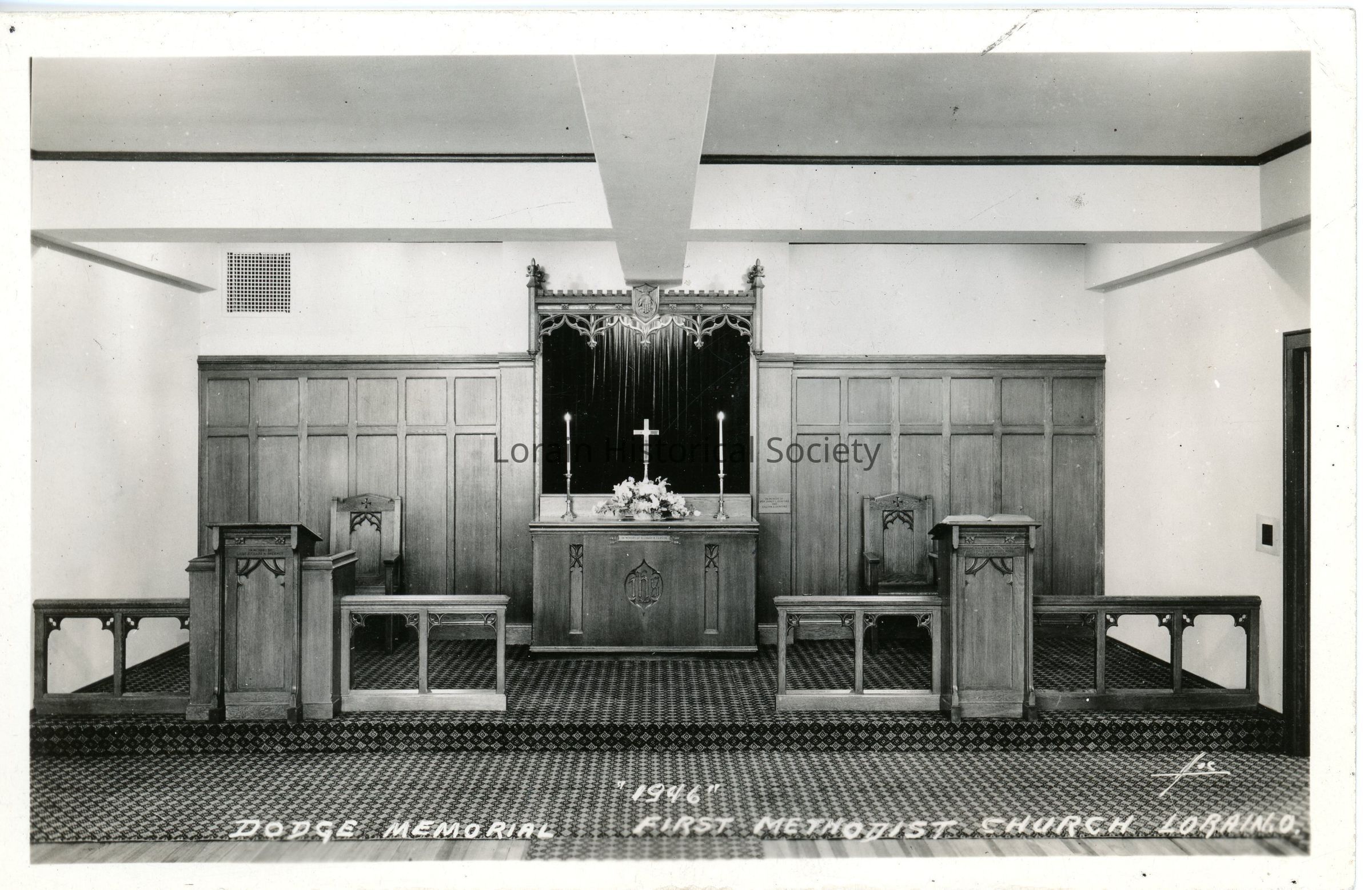 05/05/2022 AMS: jfm083104024 & jfm083104028. 95:8. Black & white postcard is view of Dodge Memorial Chapel at First Methodist Church. Postcard reads: "Dodge Memorial '1946' First Methodist Church, Lorain, O.". (Rudy Moc Photo).