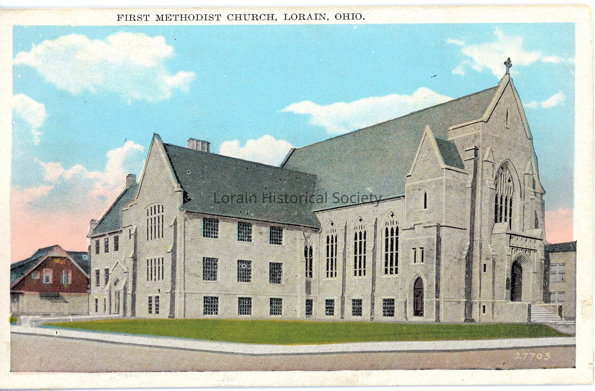 04/27/2022 AMS: jfm083104012. Color postcad is view of First Methodist Church. Postcard reads: "First Methodist Church, Lorain, Ohio".