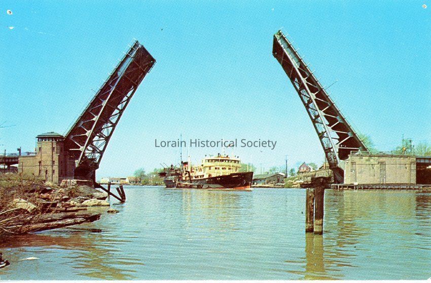 08/25/2021 AMS: cd0829036. Color Postcard is view of open Bascule Bridge. Postcard reads (on back): "LORAIN, OHIO. The Erie Ave. (Route 2 & U. S. 6) Bascule Brdige was the largest of its type in the world when completed in 1940. It is through this bridge that the large lake freighters go up the Black River to the docks of the Lorain works of the U. S. Steel Corporation."