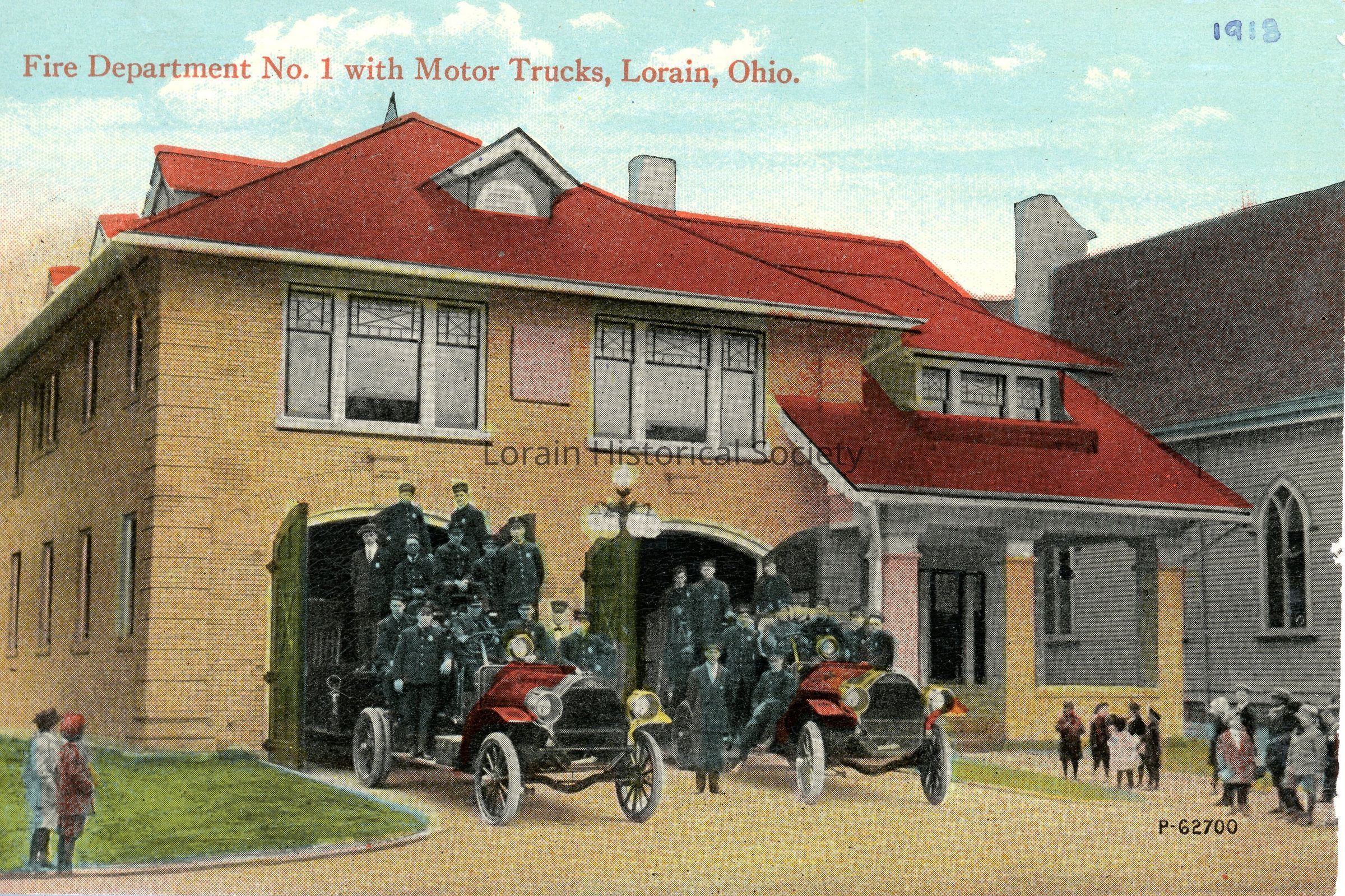 08/17/2022 AMS: jfm122303010. 84:12. Color postcard is view of No. 1 Fire Station with trucks in front and Congregational Church next door. Postcard reads: "Fire Department No. 1 with Motor Trucks, Lorain, Ohio".
