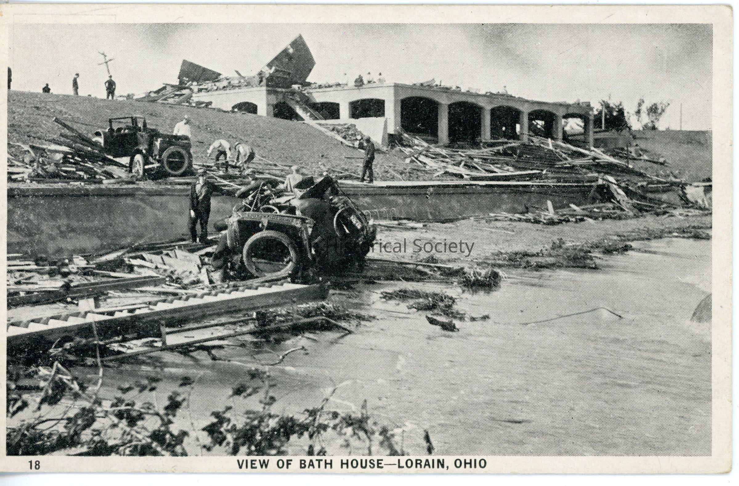 11/16/2022 AMS: cd07090148. jfm040808033. Black and white postcard is view of Bath House at Lakeview Park after 1924 Tornado. "Postcard reads: "18. View Of Bath House - Lorain, Ohio".