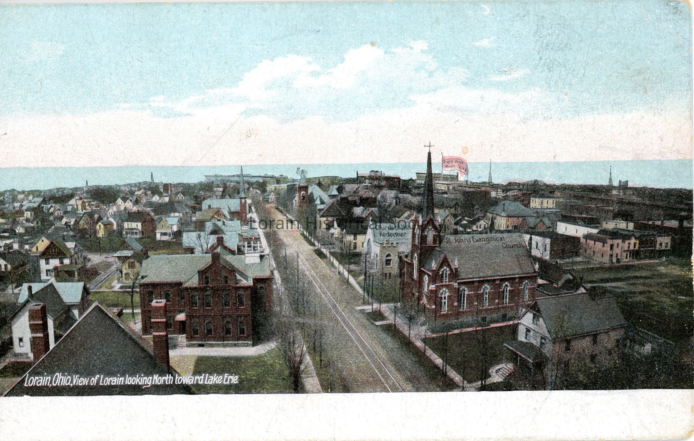 05/18/2022 AMS: jfm010405049, Color postcard is bird's eye view of Lorain with St. John's Evangelical Church in the foreground.