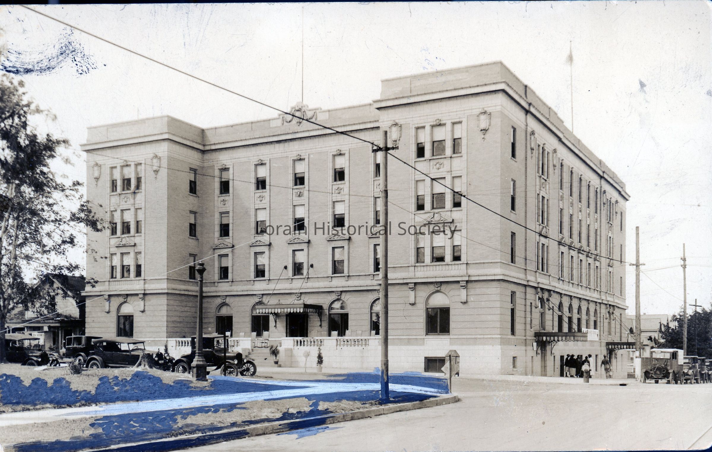 11/17/2021 AMS: Black and White Postcard is view of Hotel Antlers at corner of Washington Avenue and West Erie Avenue. This postcard was donated by Jerry A. McCoy per a letter dated 10/4/1985 stating that he found it at a show in Lancaster, PA. It has a Roy & Rosella Ewers address sticker on the back, so it probably came from their collection.