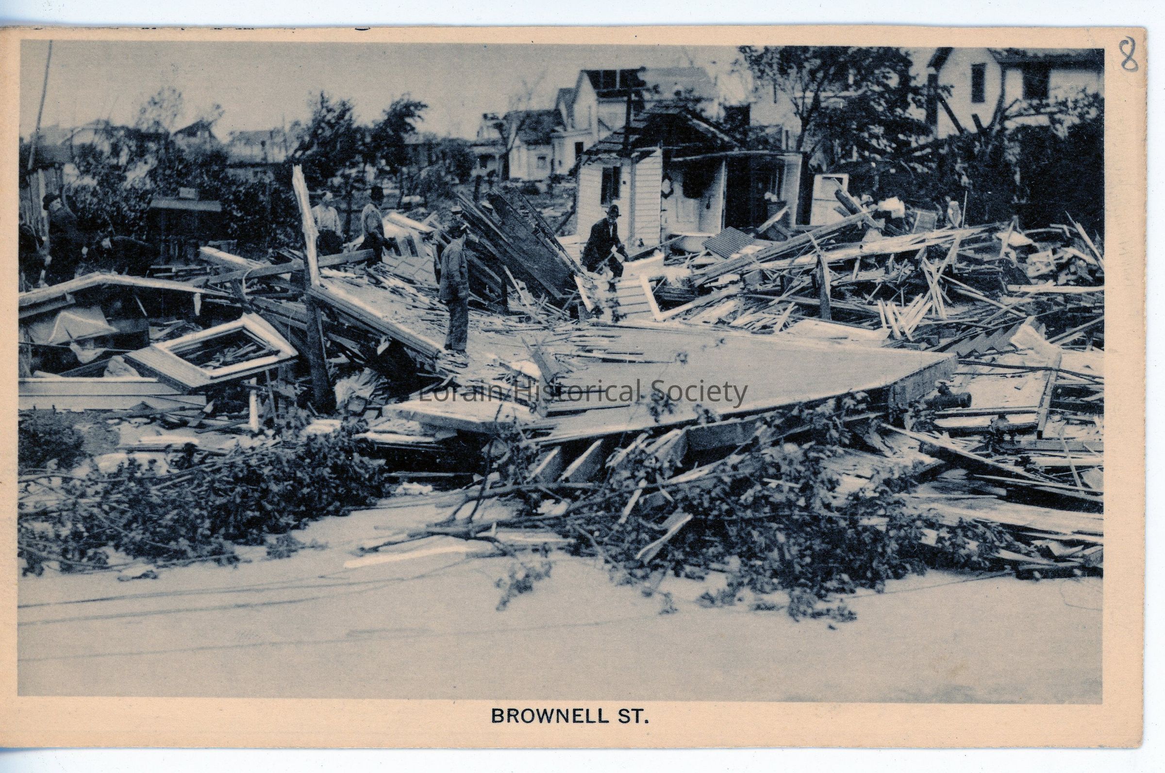 Postcard is view of 618 Brownell Avenue, Mary and William Connor home (exposed bedroom and bathroom from second floor now on street level behind debris). Postcard reads: "No. 12. BROWNELL ST., LORAIN, OHIO".Acquisition