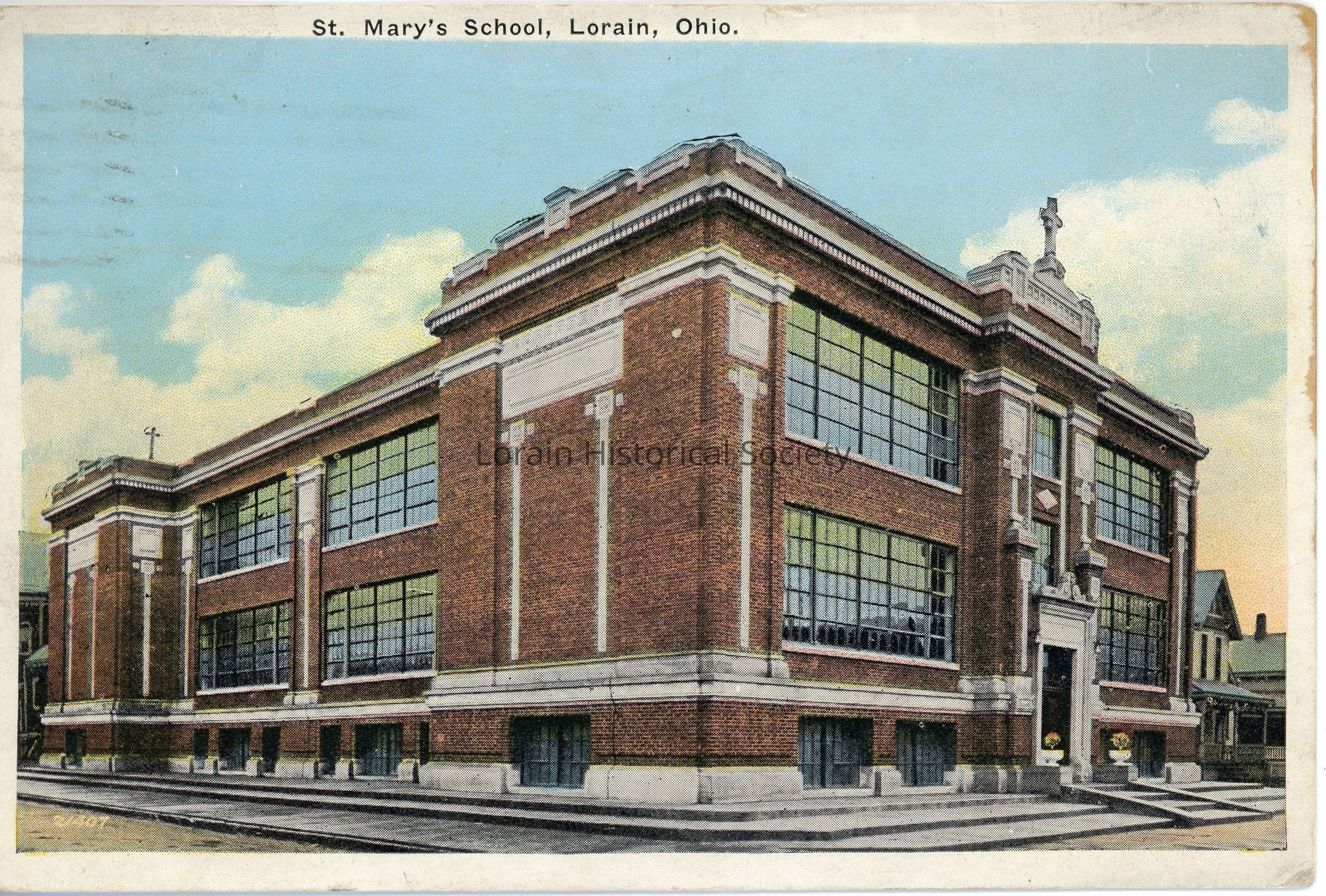 Postcard is color view of Saint Mary's School, 301-307 West Seventh Street.