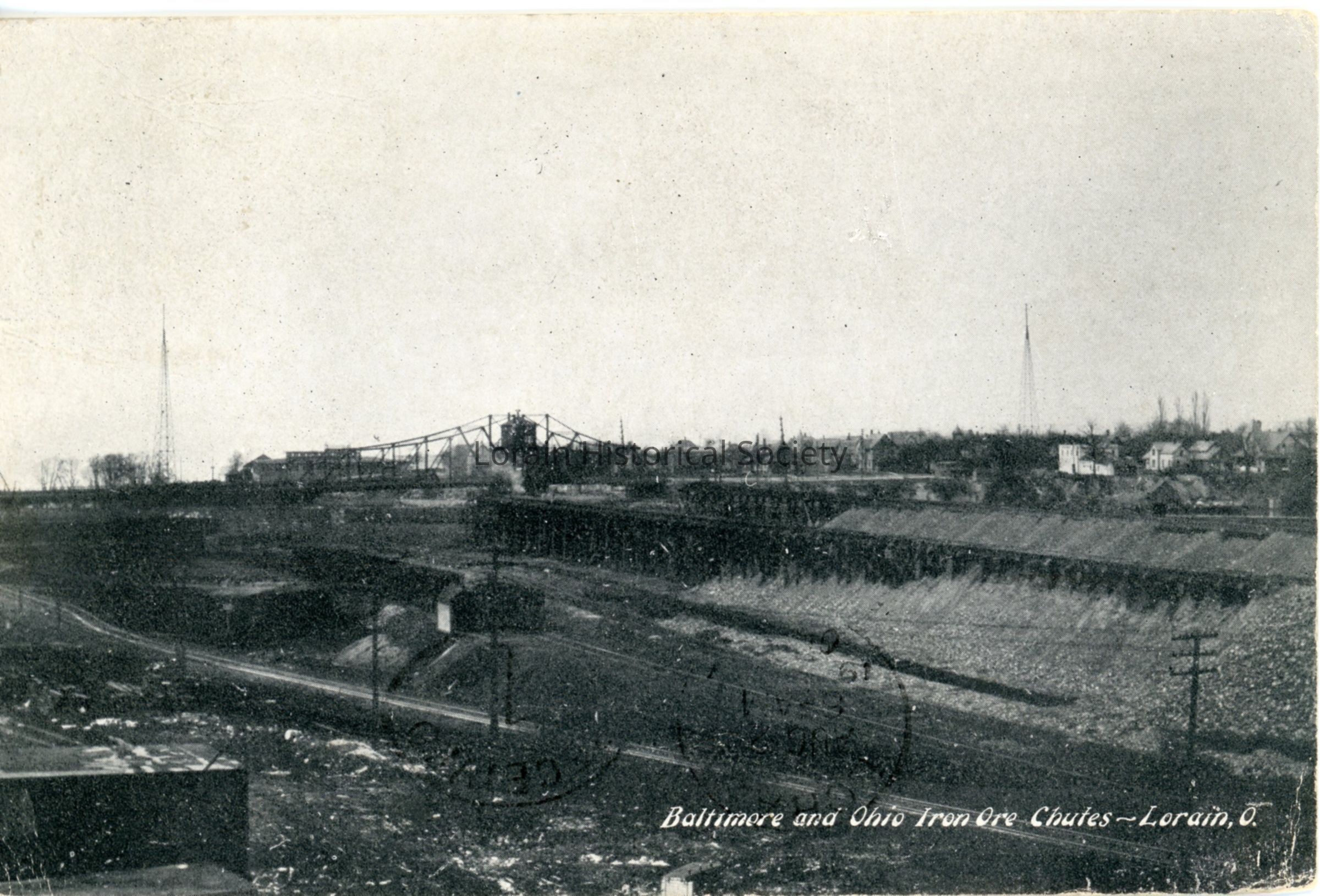 09/28/2022 AMS: jfm051104055. Black and white postcard is view of B & O Iron Ore Chutes, looking southwest from what is now Riverside Park, or close by. Postcard reads: "Baltimore and Ohio Iron Ore Chutes - Lorain, O."