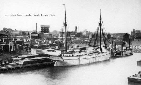 Also in file: Black and White Photo of Postcard from Calendar Page. Photo reads: "Dock Scene, Lumber Yards, Lorain, Ohio".