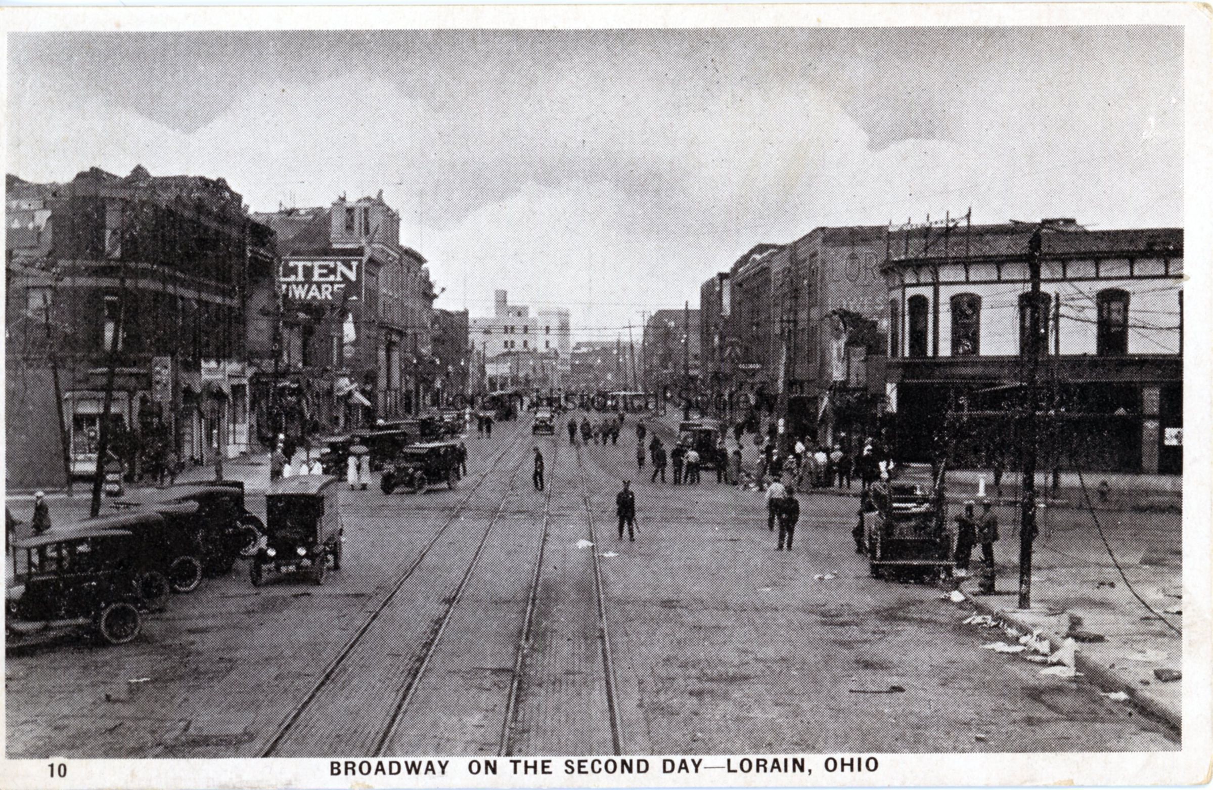 11/09/2022 AMS: cd07090139. jfm040808031. Black and white postcard is view of Broadway on second day after tornado. Postcard reads" "10. Broadway, On The Second Day - Lorain, Ohio".