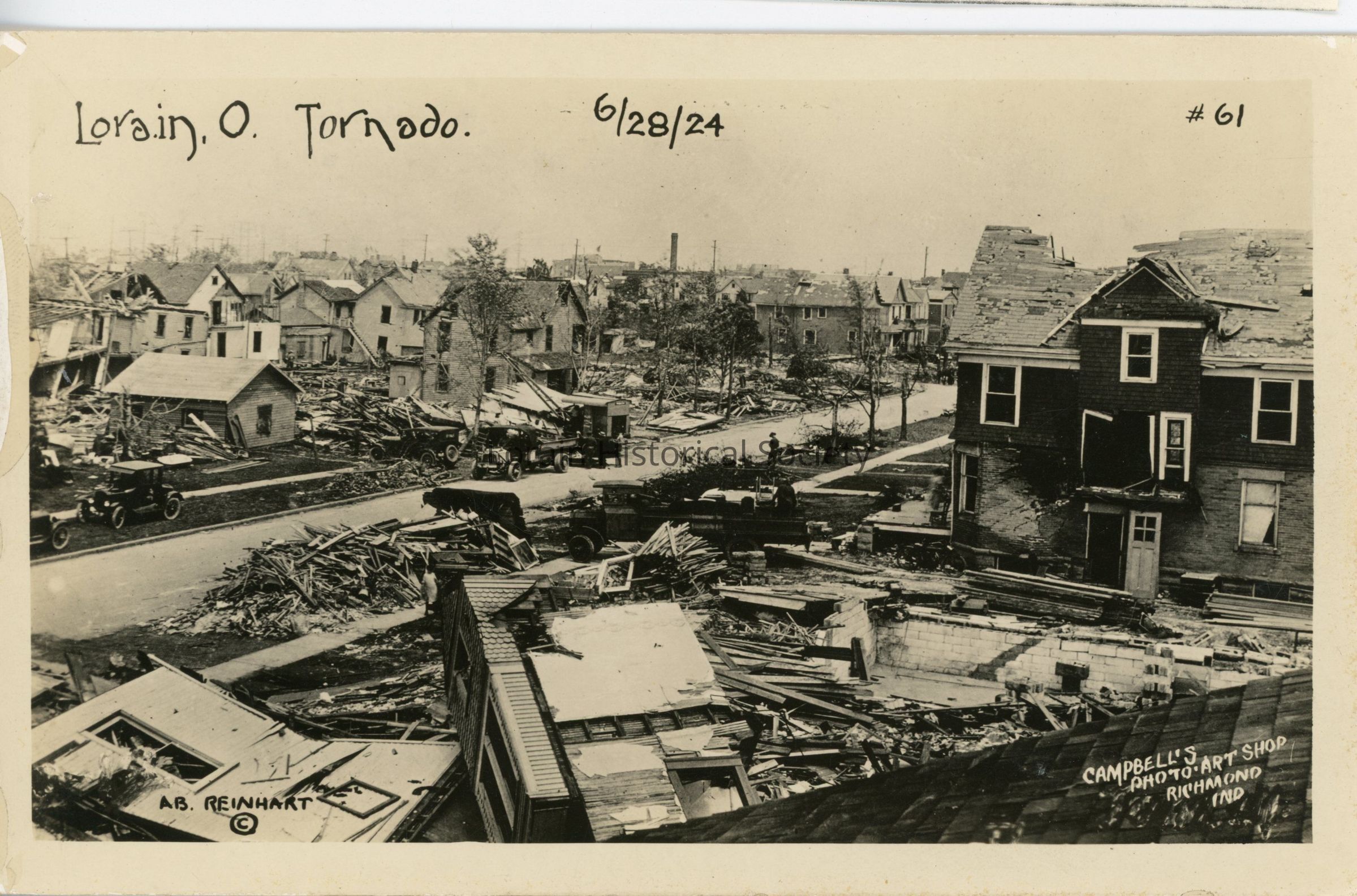 Postcard is view of corner of West Erie Avenue and West Fifth Street showing damage and destruction of homes after 1924 Tornado. Postcard reads: "LORAIN, O. TORNADO. 6/28/24 #60 AB REINHART CAMPBELL'S PHOTO ART SHOP RICHMOND IND".Acquisition