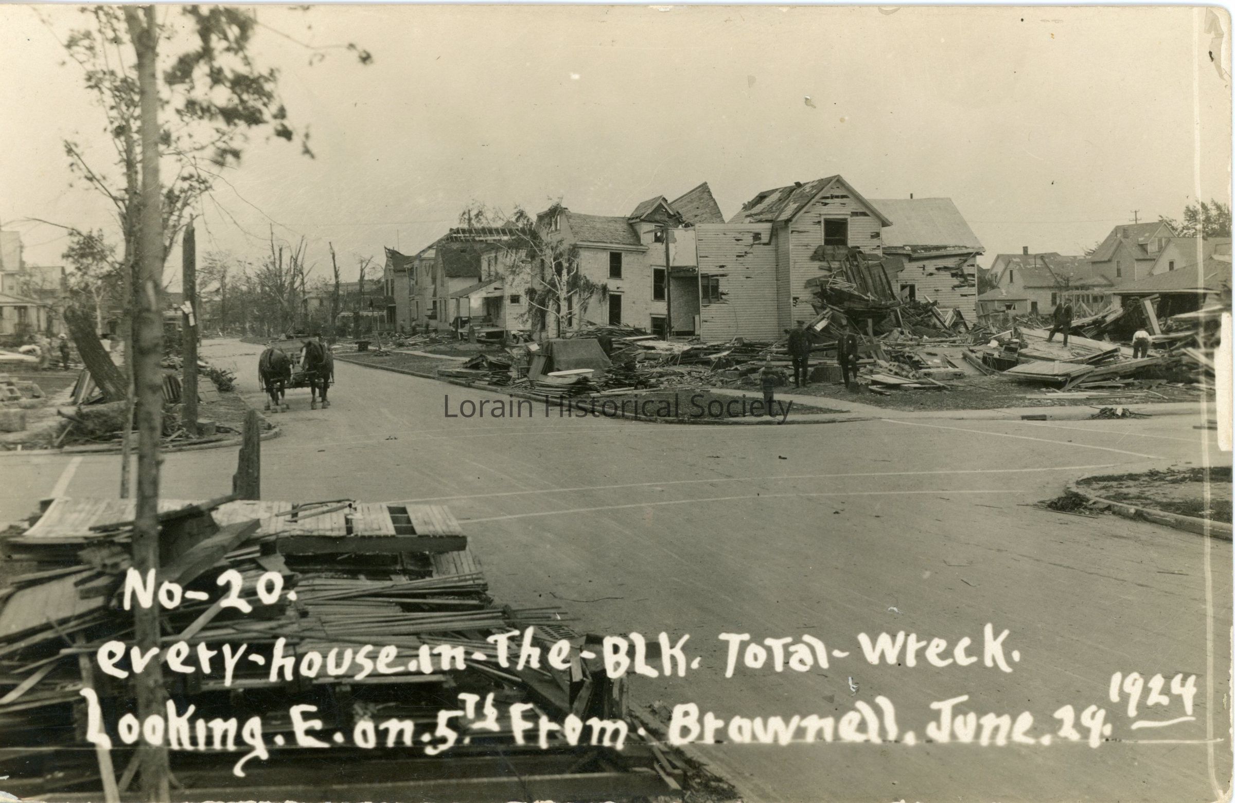 Postcard is view of wreckage of homes from 1924 Tornado, looking east on Fifth Street from Brownell Avenue Postcard reads: "No. 20. every house in the BLK Total wreck. Looking E. on 5th From Brownell June 29 1924."