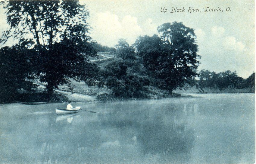 08/04/2021 AMS: Color Postcard is view of rowboat going up the Black River. Postcard reads: "Up Black River, Lorain, O." 2 copies