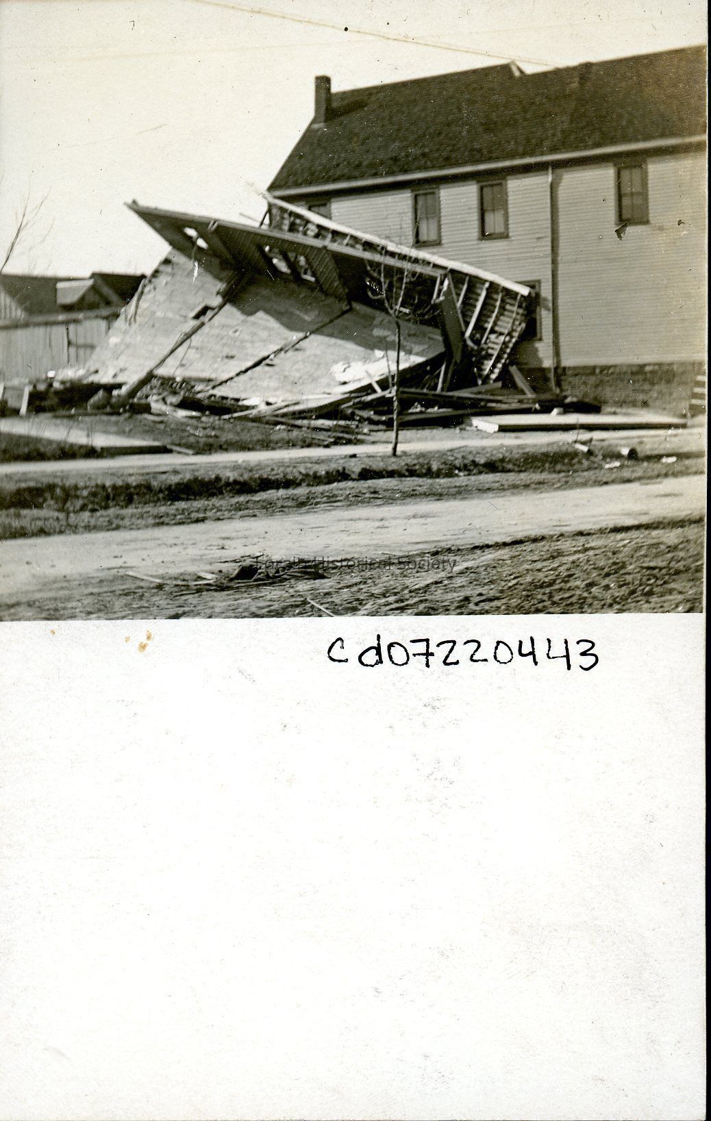 Postcard is black and white view of unidentified houses showing damage and destruction from 1924 Tornado.Acquisition