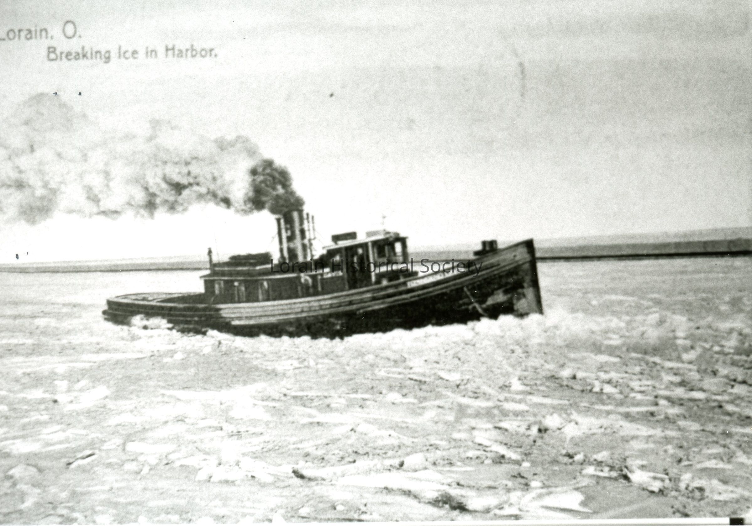 07/28/2021 AMS: Black and White Photo of Postcard is view of tug breaking ice. Postcard reads: "Lorain, O. Breaking Ice in Harbor." CA D2 F23Acquisition