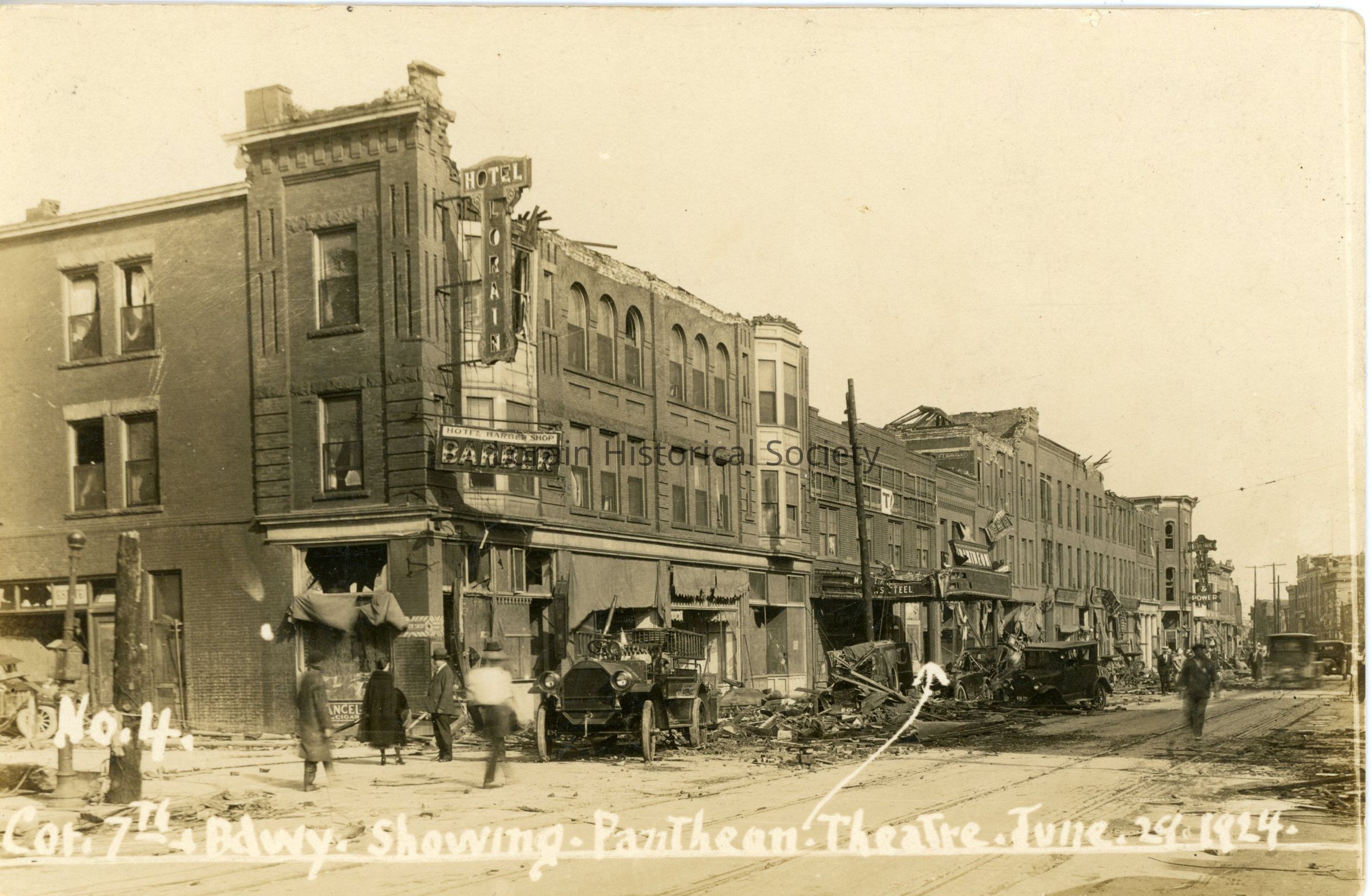 Postcard is view of the corner of 7th Street and Broadway showing damage to Lorain Hotel (on corner) and the Pantheon Theatre from 1924 Tornado. Postcard reads: "No-4. Cor. 7th & Bdwy Showing Pantheon Theatre June 29 1924".Acquisition