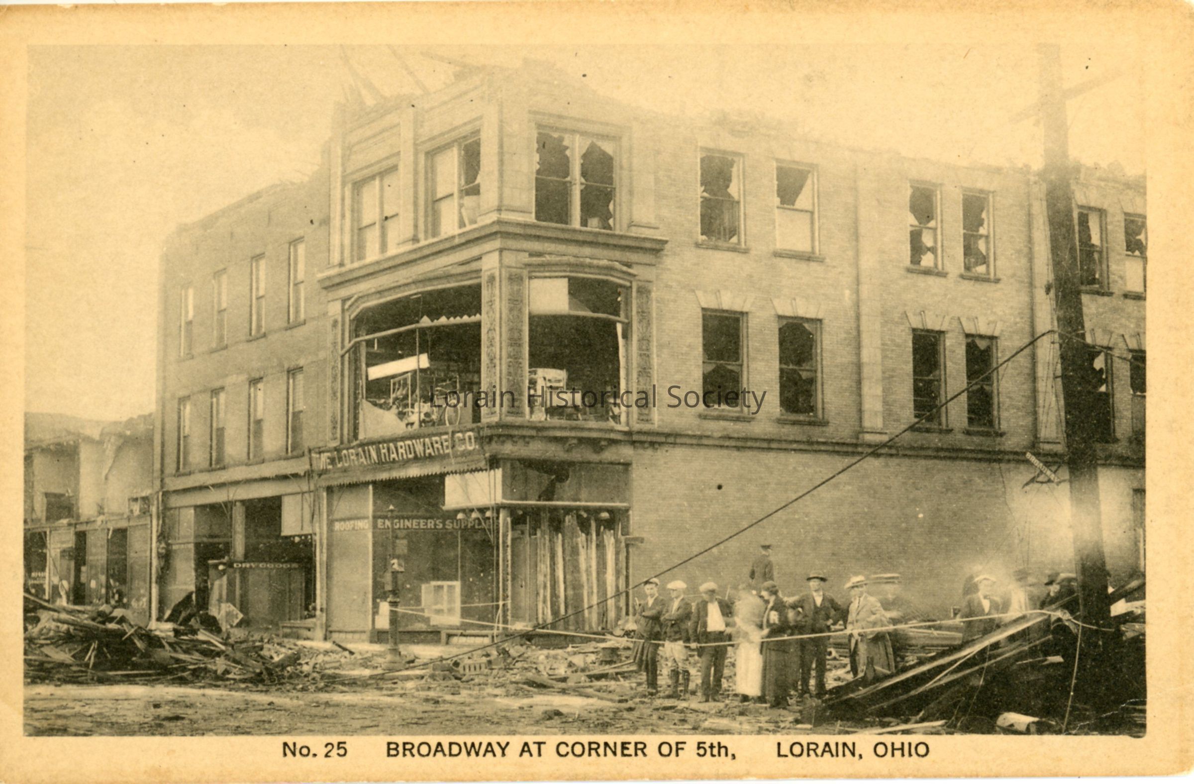 Postcard is view of Lorain Hardware Co., 502 Broadway, showing damage from 1924 Tornado. Postcard reads: "No. 25 BROADWAY AT CORNER OF 5th, Lorain, Ohio:.Acquisition