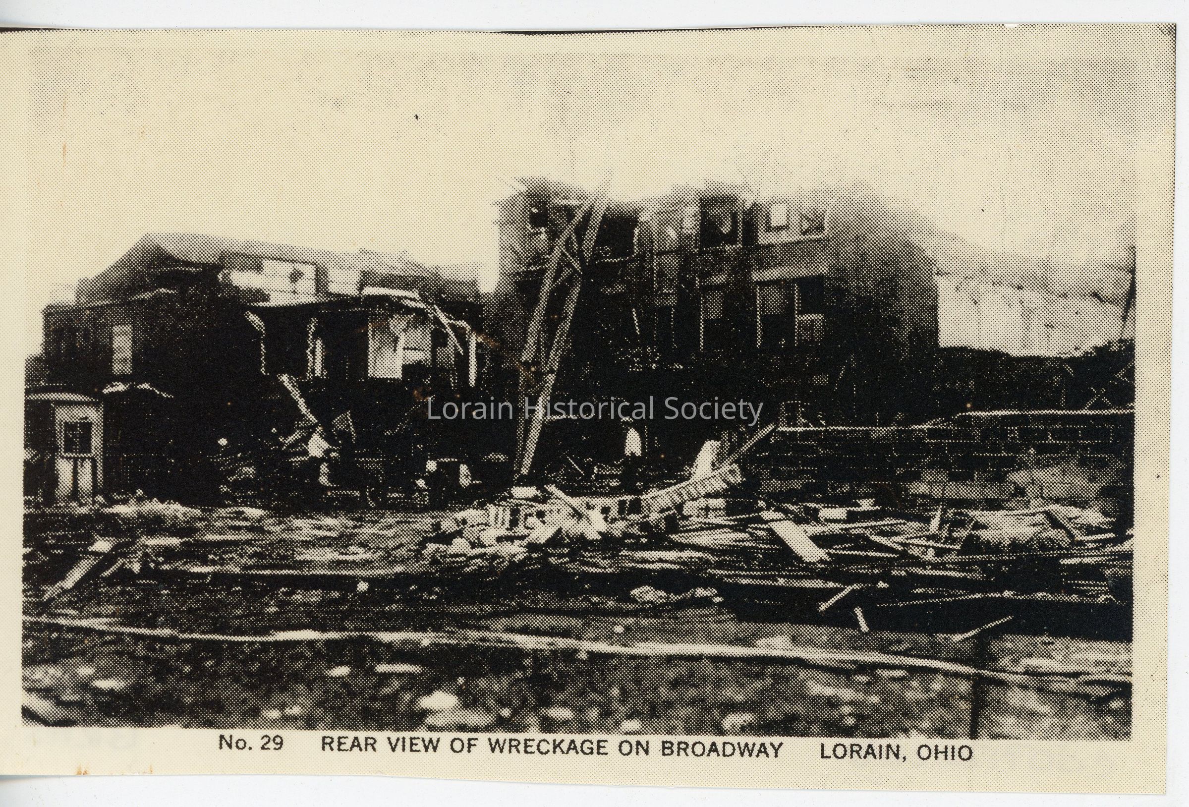 Postcard is rear view of wreckage on Broadway from 1924 Tornado. Postcard reads: "No. 29 REAR VIEW OF WRECKAGE ON BROADWAY, LORAIN, OHIO".Acquisition