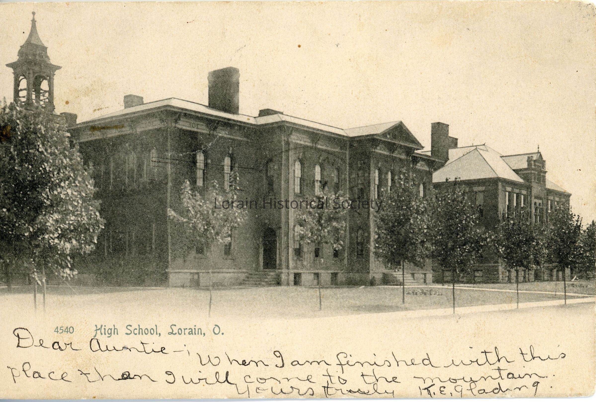 Postcard is black and white view of Lorain High School, 620 Washington Avenue.
