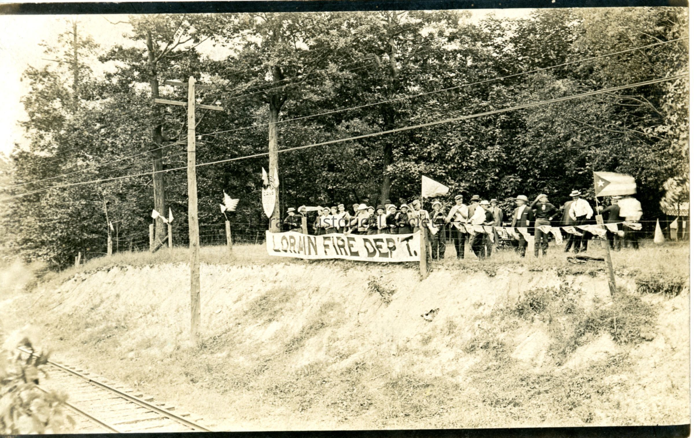 08/24/2022 AMS: jfm032304038. PIC# 19.89. Black and white postcard is view of Lorain Fire Department Picnic for members and families at Beaver Park c. 1908.
