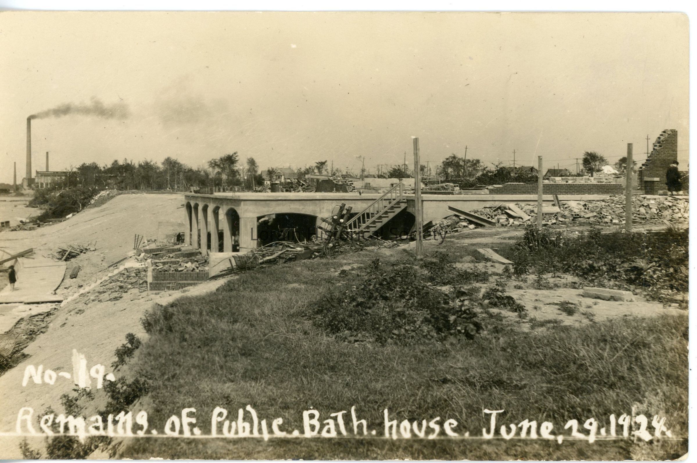 Postcard is view of Remains of Public Bath House at Lakeview Park destroyed by 1924 Tornado. Postcard reads: "No. 19. Remains of Public Bath house June 29 1924".Acquisition
