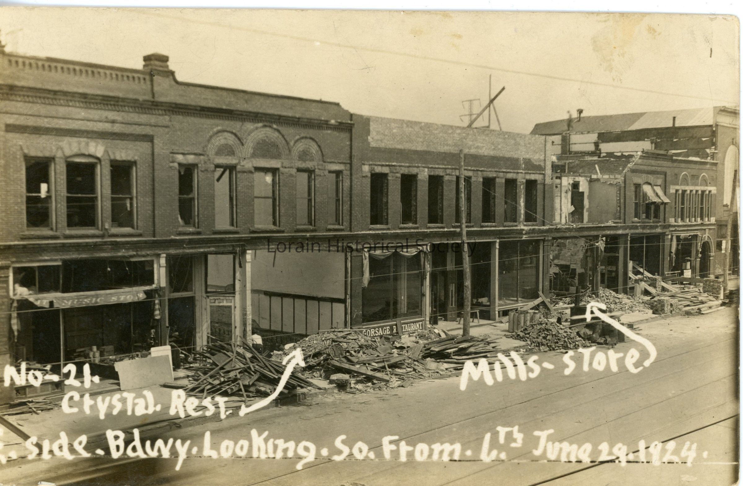 Postcard is view of east side of Broadway looking south from Sixth Street, showing damage to Crystal Restaurant and Mills Feed Store from 1924 Tornado. Postcard reads: "No. 21. E. side Bdwy. Looking So. From 6th June 29 1924.Acquisition