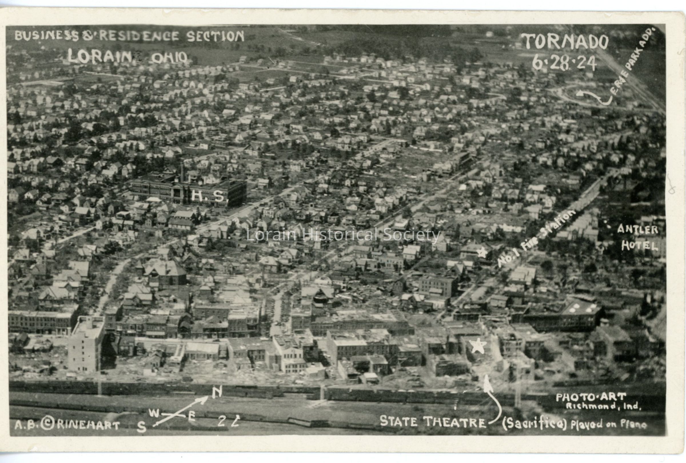 Postcard is aerial view of Lorain Business and Residential Sections after 1924 Tornado, noting locations of High School, No. 1 Fire Station, Antlers Hotel and State Theatre (Sacrifice played on piano). Postcard reads: "LORAIN, OHIO TORNADO 6-28-24 NO. 22 A. B. RINEHART PHOTO ART Richmond Ind".Acquisition