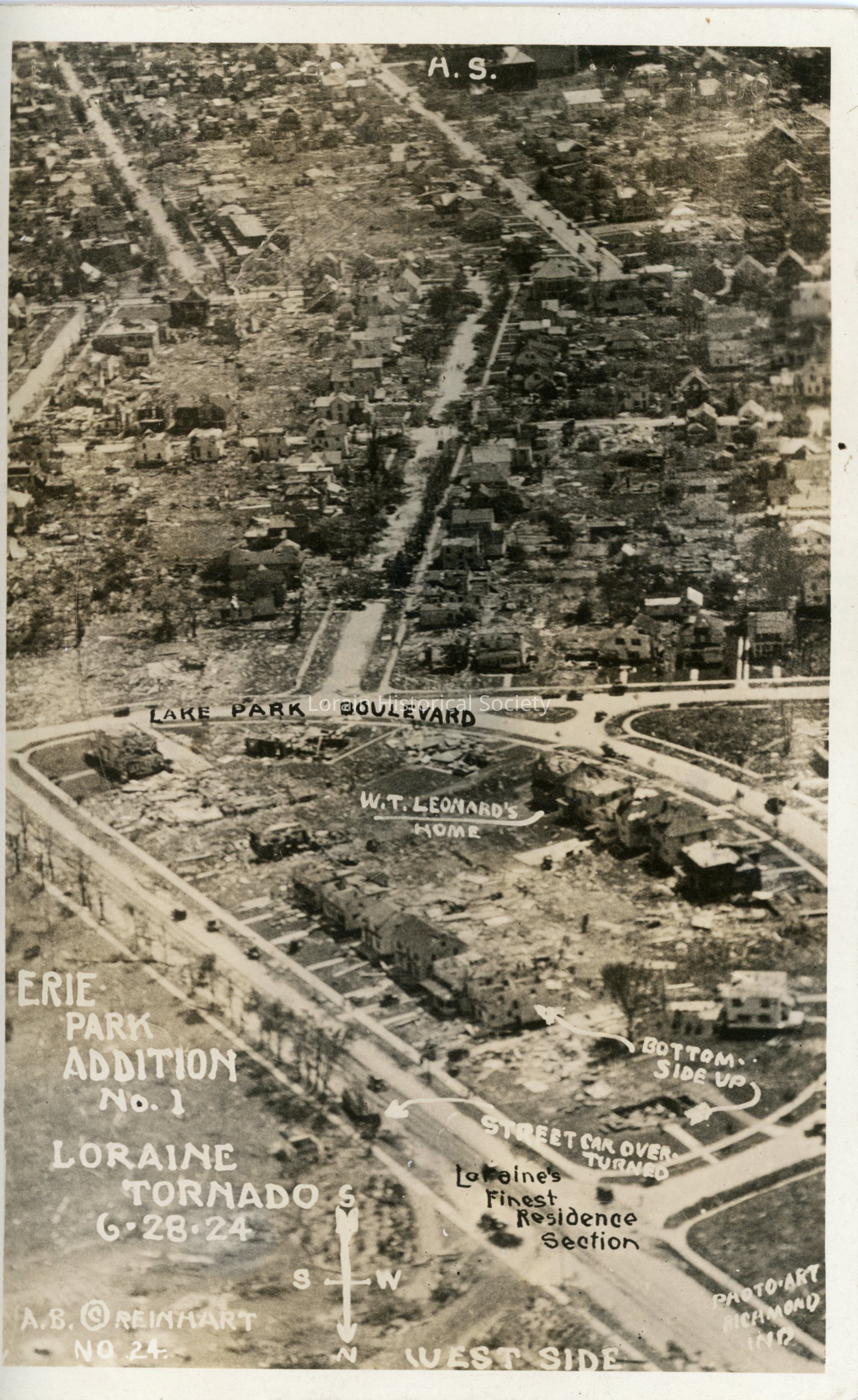 Postcard is aerial view of Erie Park Addition No. 1 after 1924 Tornado, noting locations of Lake Park Boulevard (South Lakeview Boulevard), W. T. Leonard's Home, Bottom Side Up House, Street Car Turned Over (West Erie Avenue), and Lorain's Finest Residence Section. Postcard reads: "ERIE PARK ADDITION No. 1 LORAINE TORNADO 6-28-24 WEST SIDE NO. 24