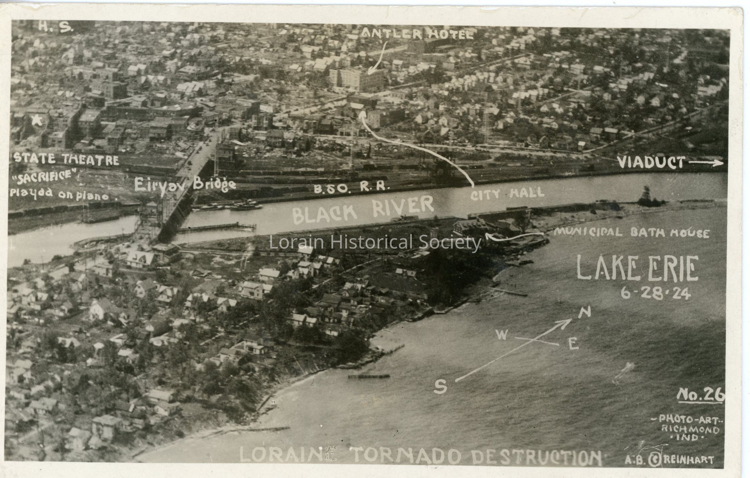 Postcard is aerial view of Lake Erie Shoreline Showing Business and Residential Sections of Lorain, noting locations of State Theatre ("Sacrifice" played on piano), Erie Av Bridge, B&O RR, Black River, Viaduct and Municipal Bath House. Postcard reads: "LORAIN TORNADO DESTRUCTION LAKE ERIE 6-28-24 NO. 26 A. B. RINEHART PHOTO ART RICHMOND IND".Acquisition