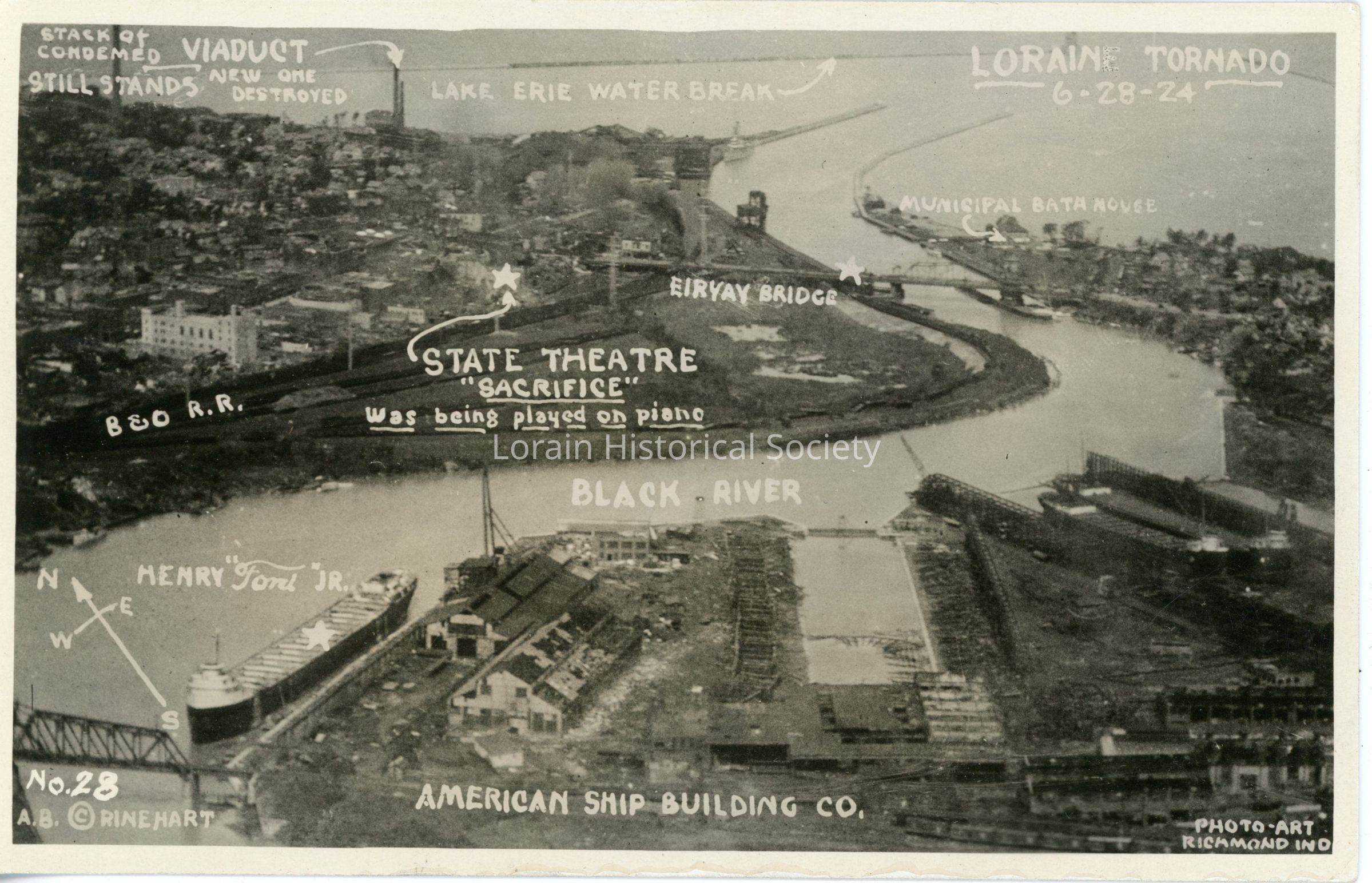 Postcard is aerial view of Lorain Black River, noting locations of Viaduct, Stack of condemned power plant still standing and new stack destroyed, B&O RR, State Theatre ("Sacrifice" was being play on piano), Erieav Bridge, Henry Ford, Jr. ship docked at ship yards, and American Ship Building Co. Postcard reads: "AMERICAN SHIP BUILDING CO. LORAIN TORNADO 6-28-24 NO. 28 A. B. RINEHART PHOTO ART RICHMOND IND.Acquisition