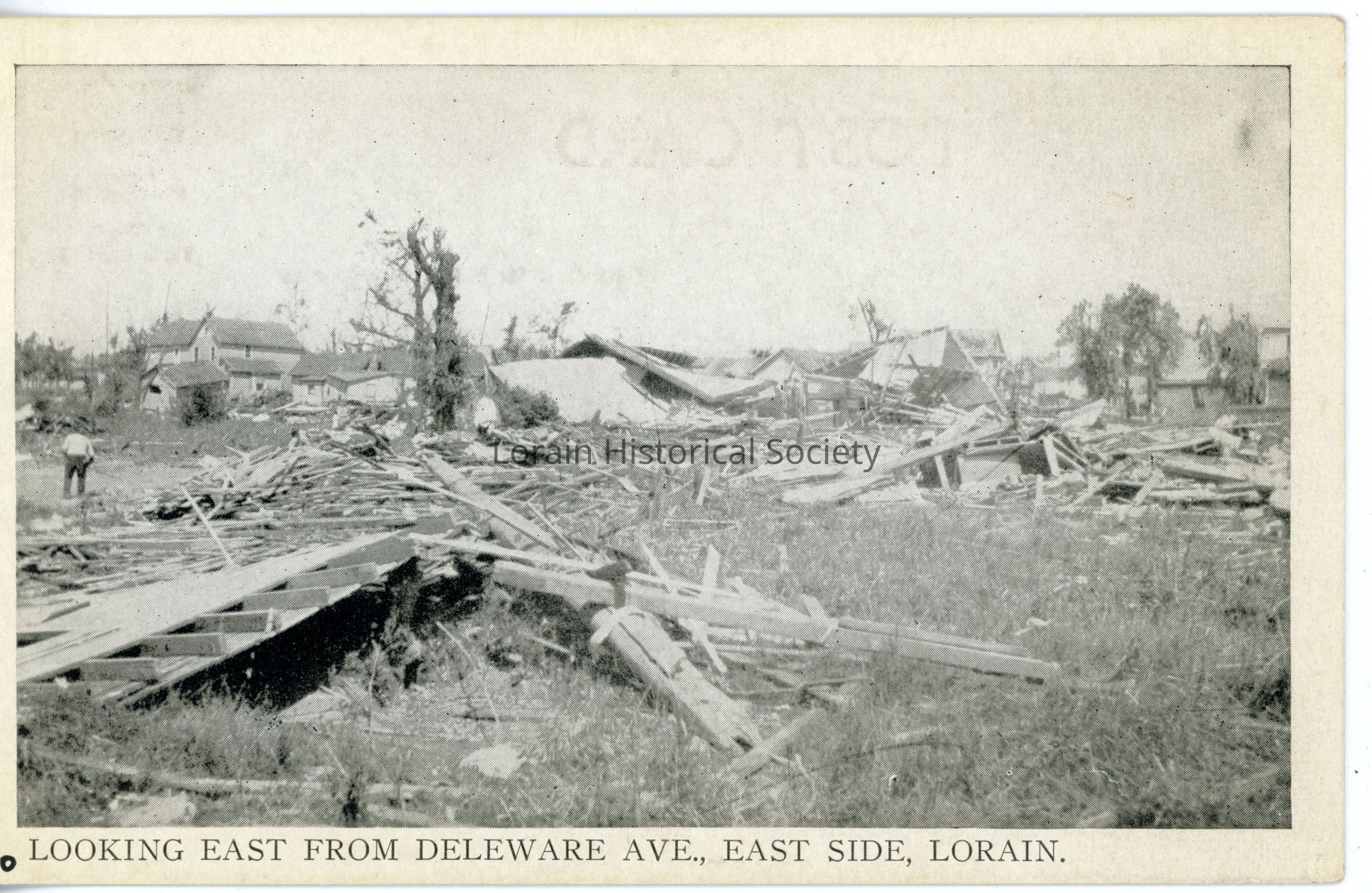 12/14/2022 AMS: cd07090169. jfm040808039. Black and white postcard is view of tornado damage on Delaware Avenue, looking east toward Florida Avenue, Postcard reads: "10. Looking East From Delaware Ave., East Side, Lorain".