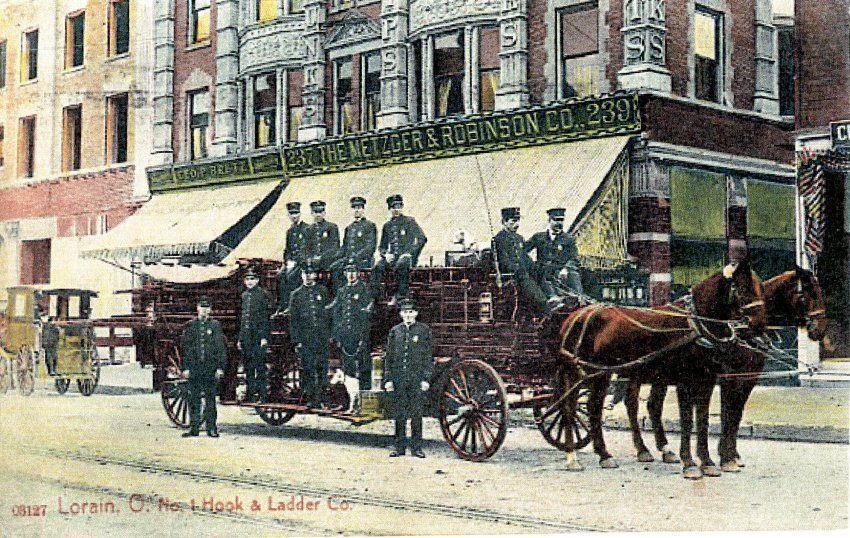 08/10/2022 AMS: Color photocopy of postcard is view of No. 1 Hook and Ladder Company in front of Metzer Robinson's on Broadway, Lorain, Ohio. Postcard reads: "03127. Lorain, O. No. 1 Hook and Ladder Co."